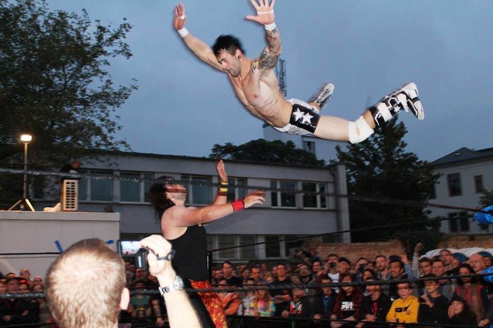 Fliegende Ringer – Foto: PR/Linda Scholz, 2016In der Kulisse zwischen den alten Betonburgen entwickelt sich ein wahrer „Hexenkessel“. Mit dabei sind unter anderem: Marius Al-Ani – amtierender European-Champion, Herausforderer Koray, Robert Kaiser, Laurance Roman und die Tag-Teams Posse in Effect und Johnny Rancid & Franz Engel und viele mehr.