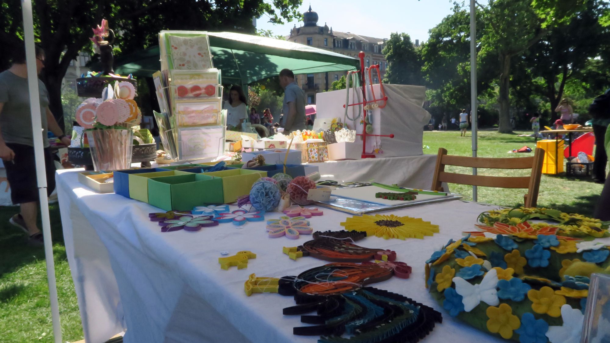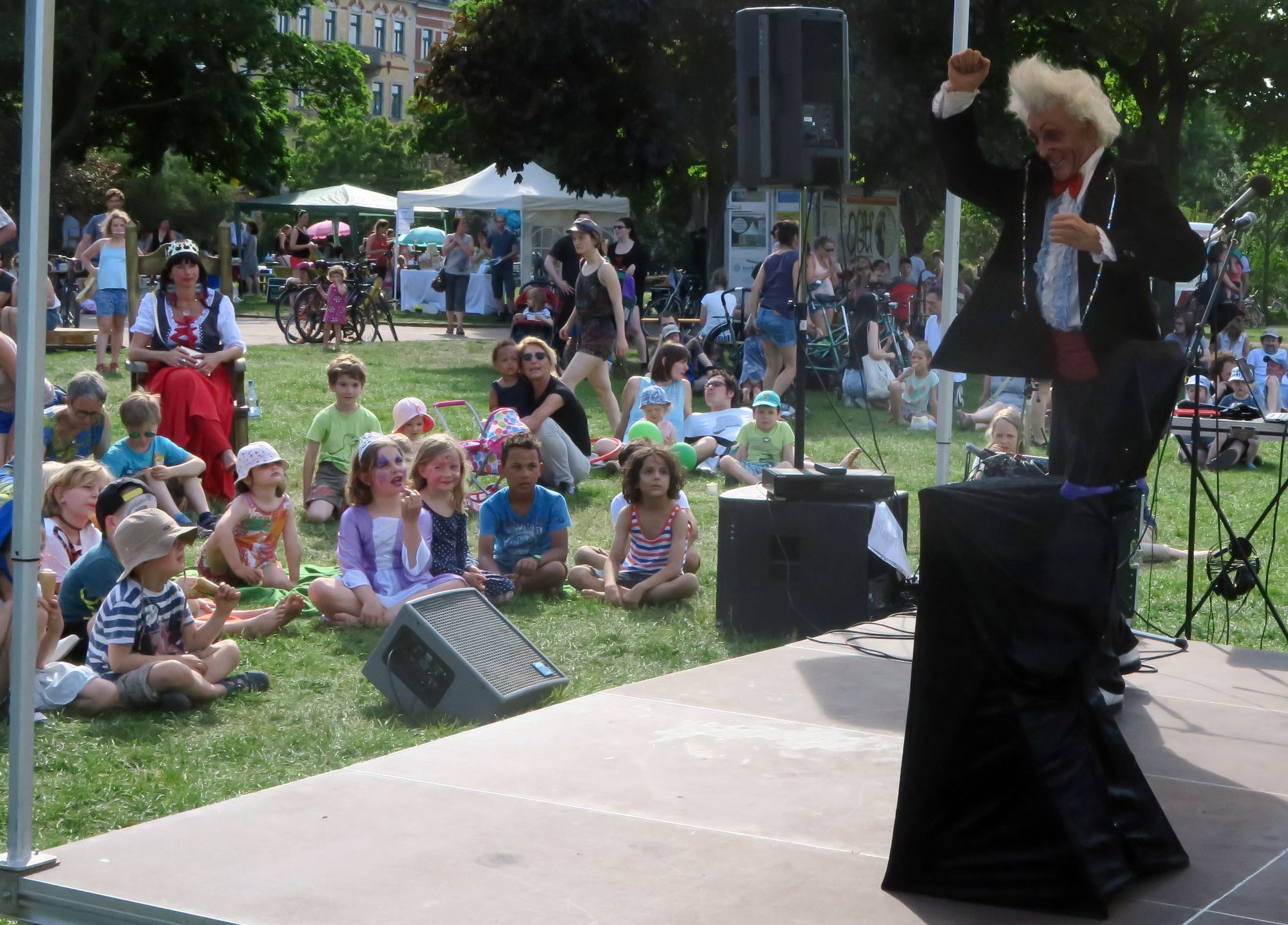 An den Schmink- und Maltischen wurden Kindergesichter und Papier verziert. Und auch die eine oder andere stolze Mutti hatte anschließend ein paar Farbtupfer im Gesicht. Auf der kleinen Schowbühne trotzten die Clowns, Musiker und Pantomime Rainer König der Hitze.