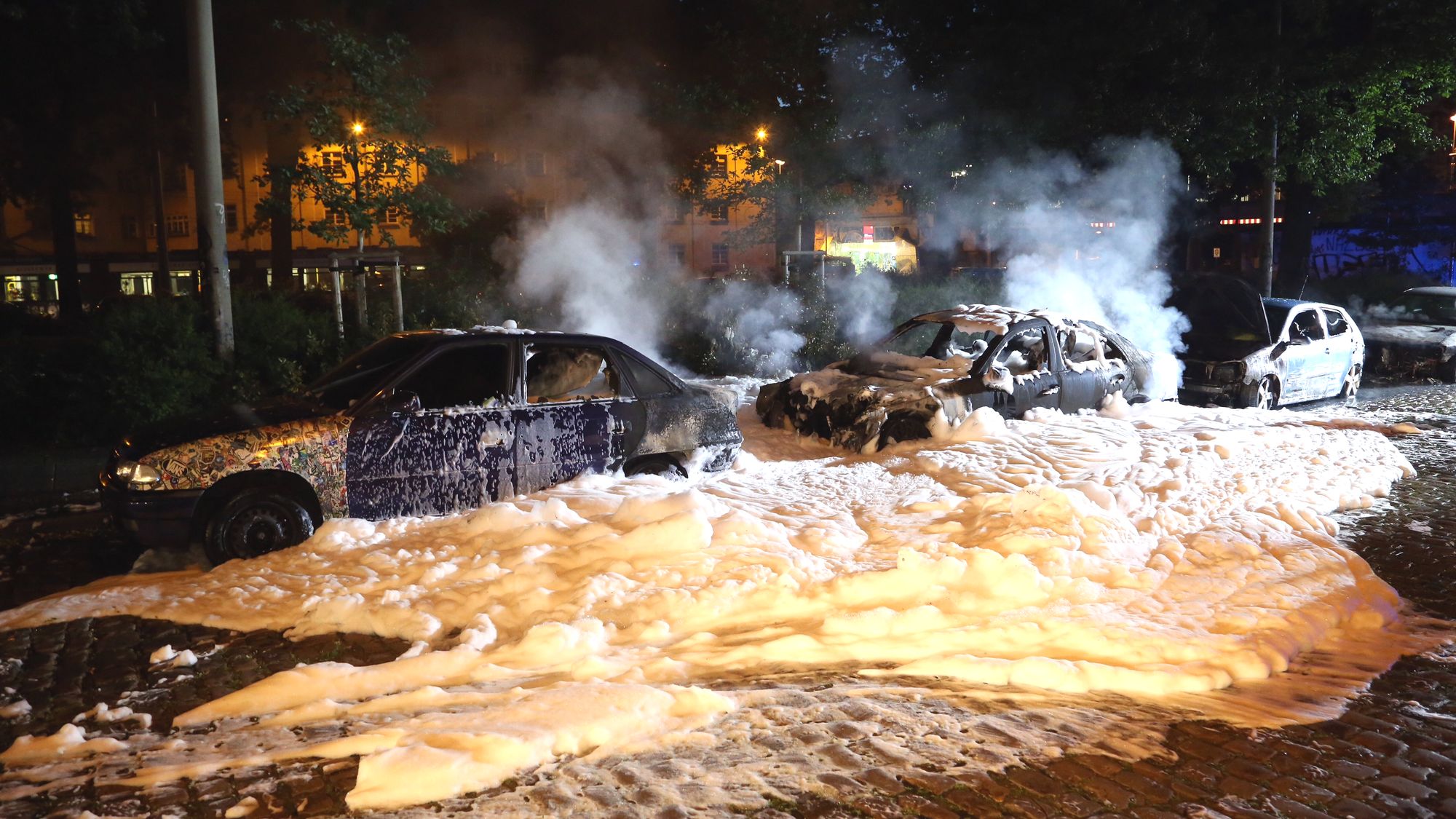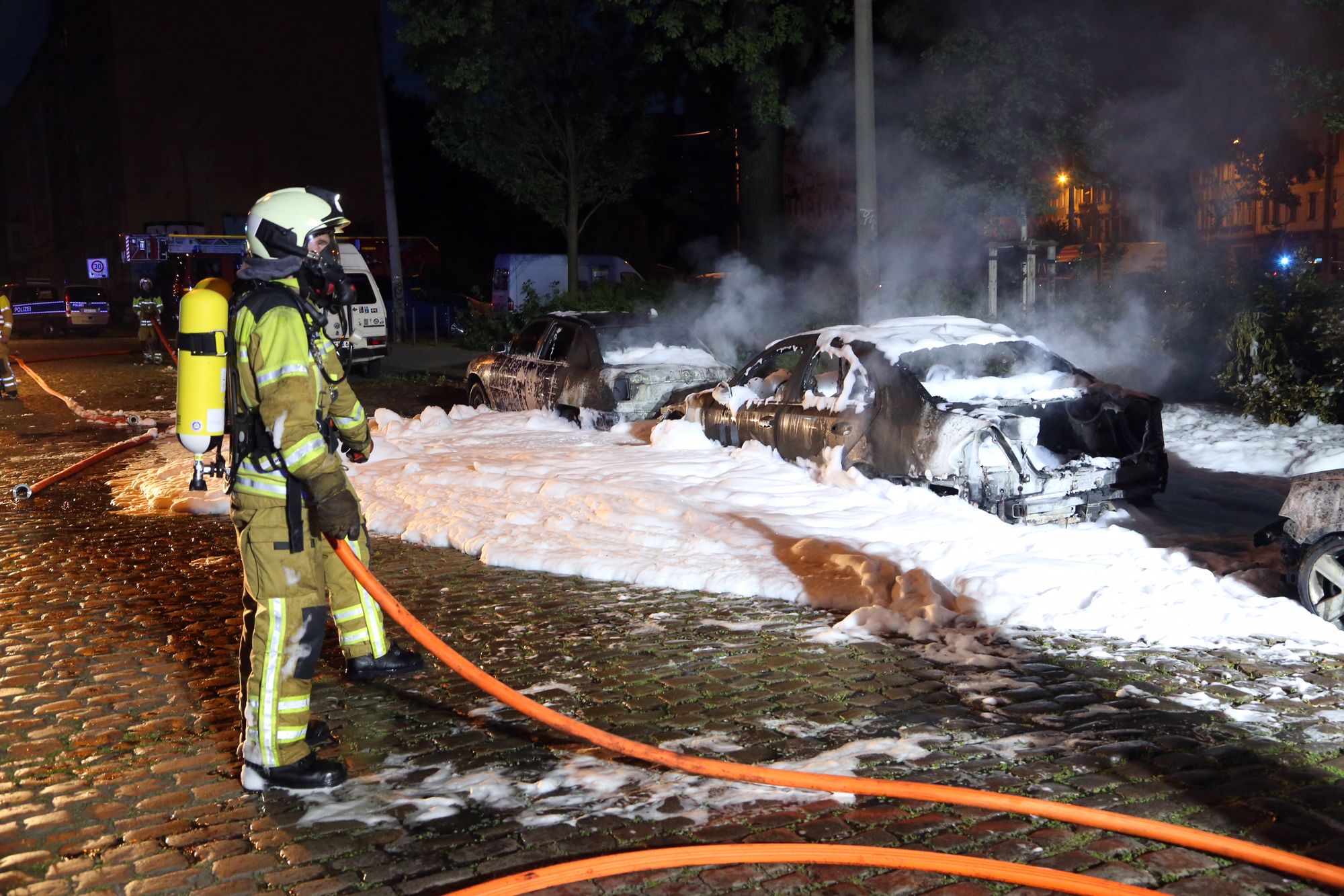 Die beiden Unbekannten flüchteten, nachdem der Mercedes bereits in Flammen stand, über die Conradstraße in Richtung Friedensstraße. Heute wird ein Brandursachenermittler den Tatort untersuchen. Wie der zuständige Polizeiführer auf Nachfrage mitteilte, wird der Brandanschlag direkt an das operative Abwehrzentrum (OAZ) weitergemeldet. Das für extremistische Straftaten zuständige OAZ ermittelt bereits wegen zweier ähnlich gelagerter Brandstiftungen. (Neustadt-Geflüster vom 9. Juni) Ob ein Zusammenhang auch zum dem heutigen Fall besteht ist derzeit noch unklar.