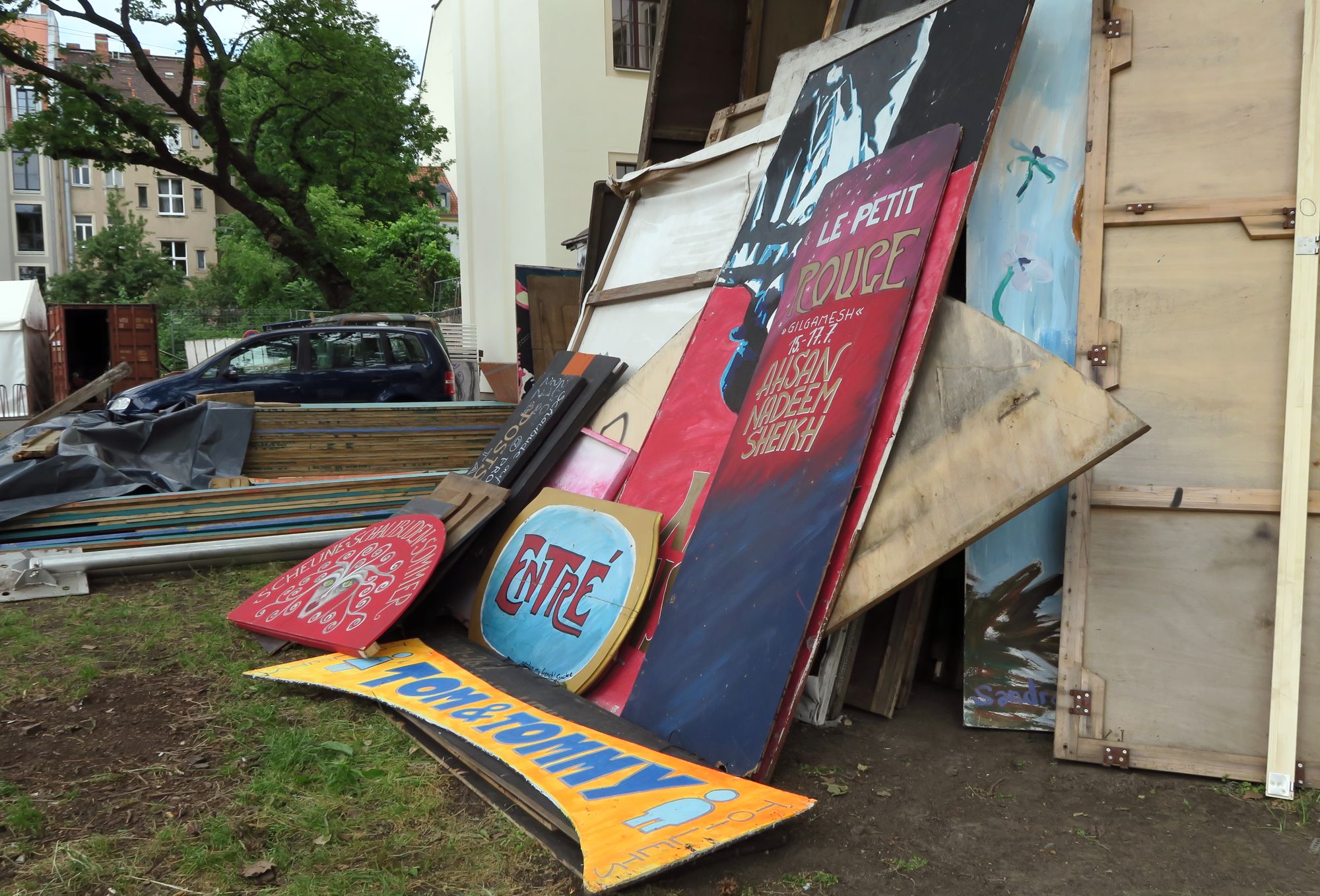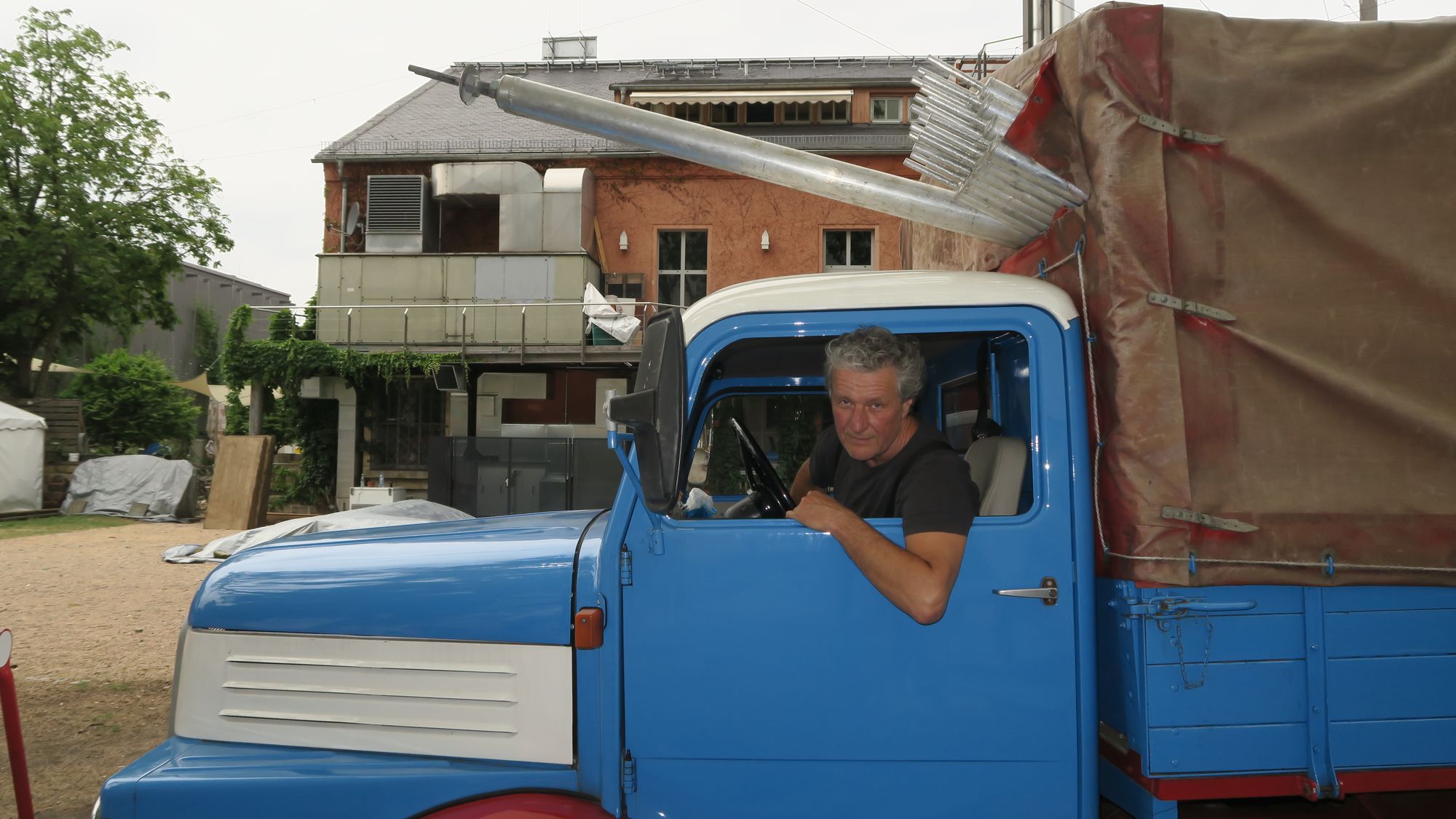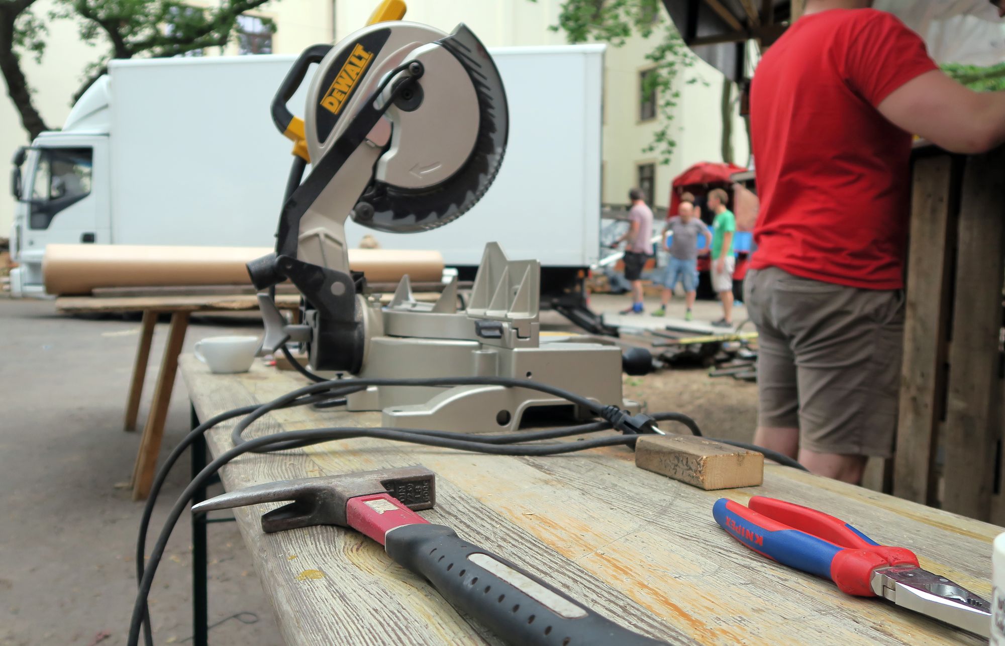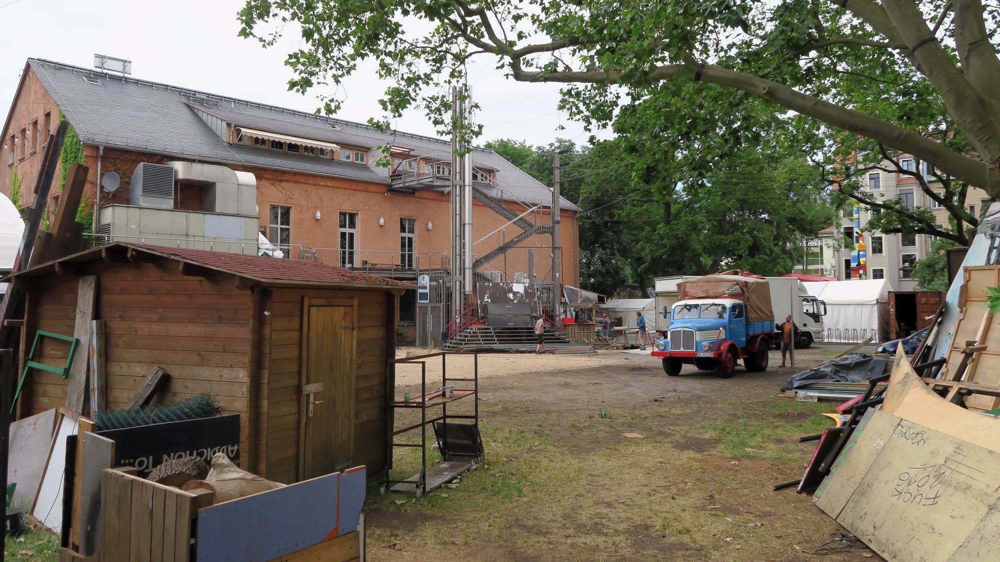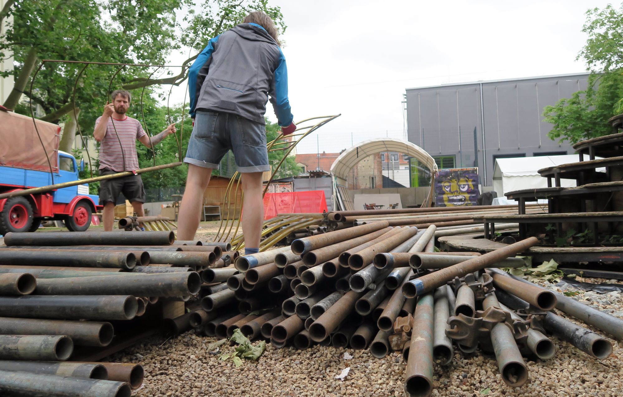 Seit dem Wochenende wird nun aufgebaut. „Wir haben ein festes Team von sechs Technikern, die mit unseren künstlerischen Ideen gut zurecht kommen“, erzählt Raeder. Dazu gibt es noch ein paar ehrenamtliche Helfer, die Scheune borgt Werkzeug aus. Auf dem Platz hinter der Scheune, der einst eine Hundewiese war wird geschraubt, gebohrt, gesägt und geflucht. Aber es geht vorwärts. „Normalerweise sind wir etwa eine Stunde vor der Eröffnung fast fertig“, schmunzelt Raeder, der dann wieder im Smoking über das Gelände führen wird.