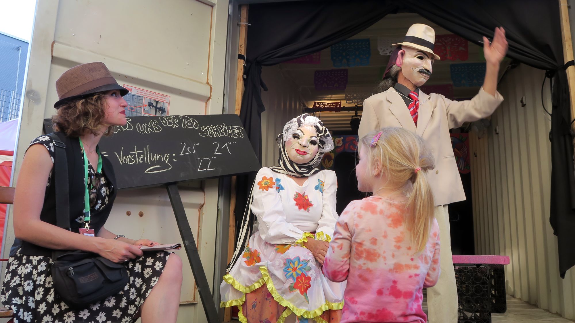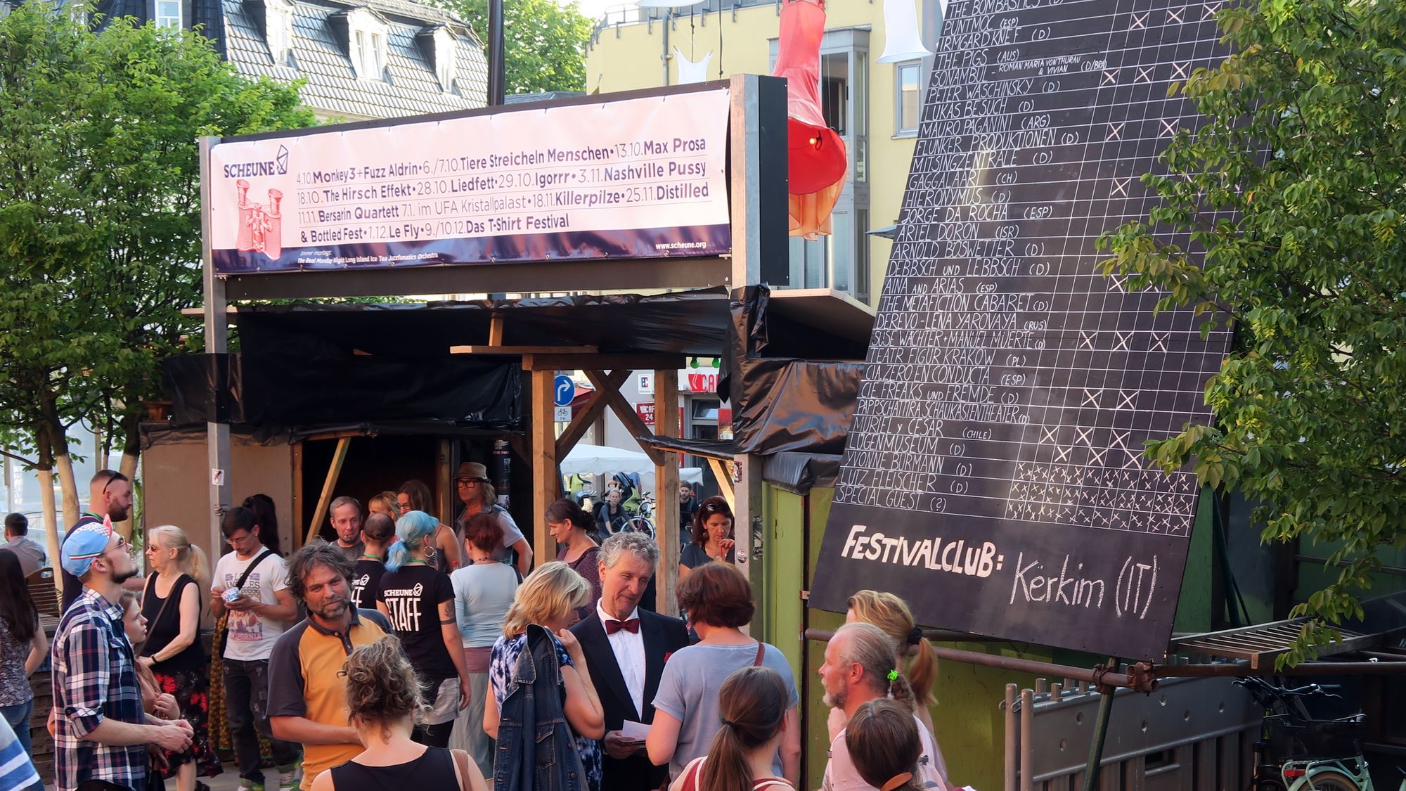 Der Festivaldirektor (mit Smoking und Fliege) erläutert das Programm.Zur Jubiläumsauflage präsentiert sich der Schaubudensommer ziemlich klein und eng. Bei meinen Besuchen am Donnerstag und Sonntag zeigte sich die Budenwiese kuschelig und gemütlich. Die neuen Eintrittsregelungen konnten dem Publikumsandrang kaum etwas anhaben. Die Schlangen am Einlass, am Ticketschalter und vor den Zelten waren immer noch da. Und zumindest bei Irmgard kam ich nur mit viel Glück und einer energischen Begleiterin überhaupt hinein. Aber der Reihe nach.