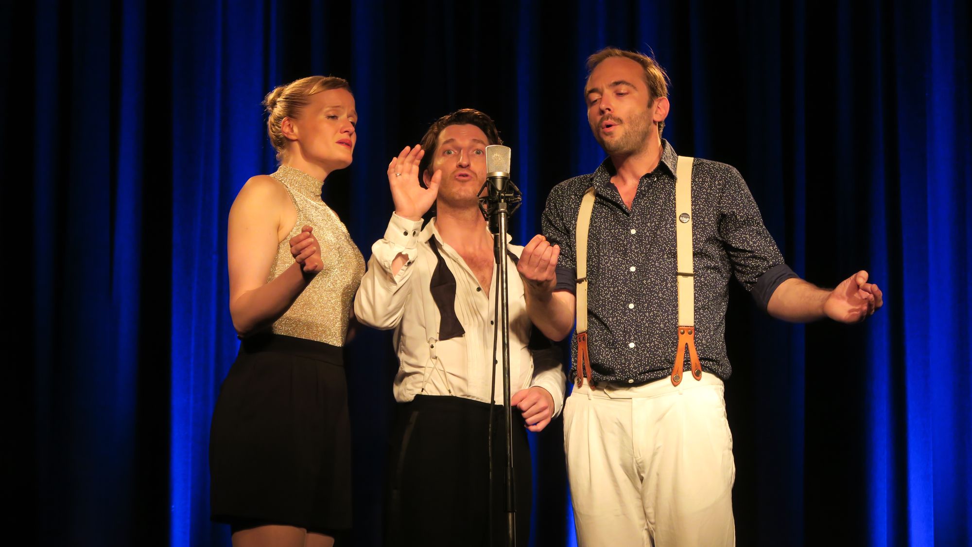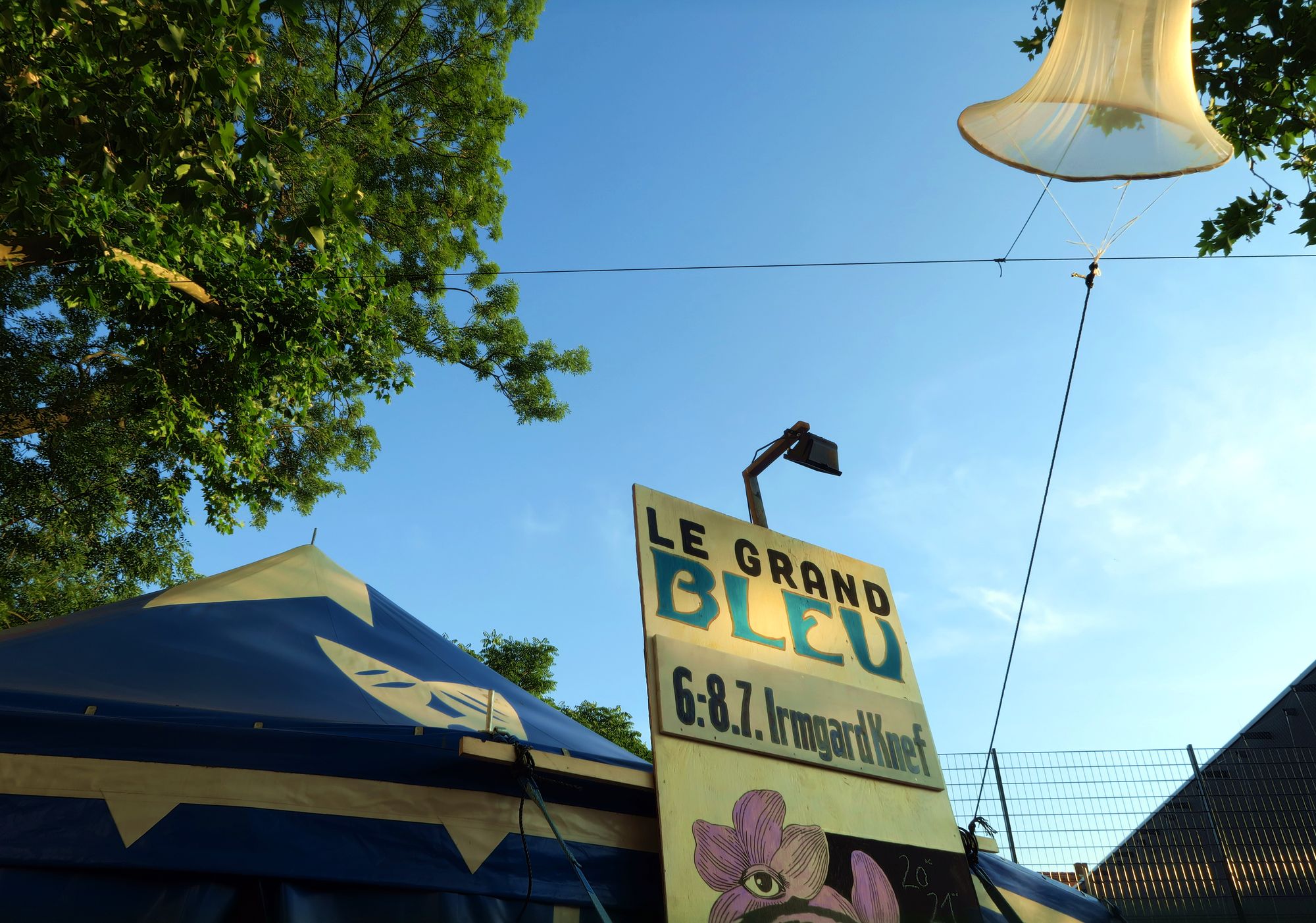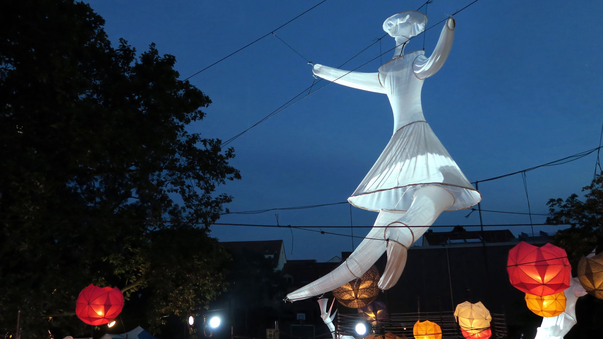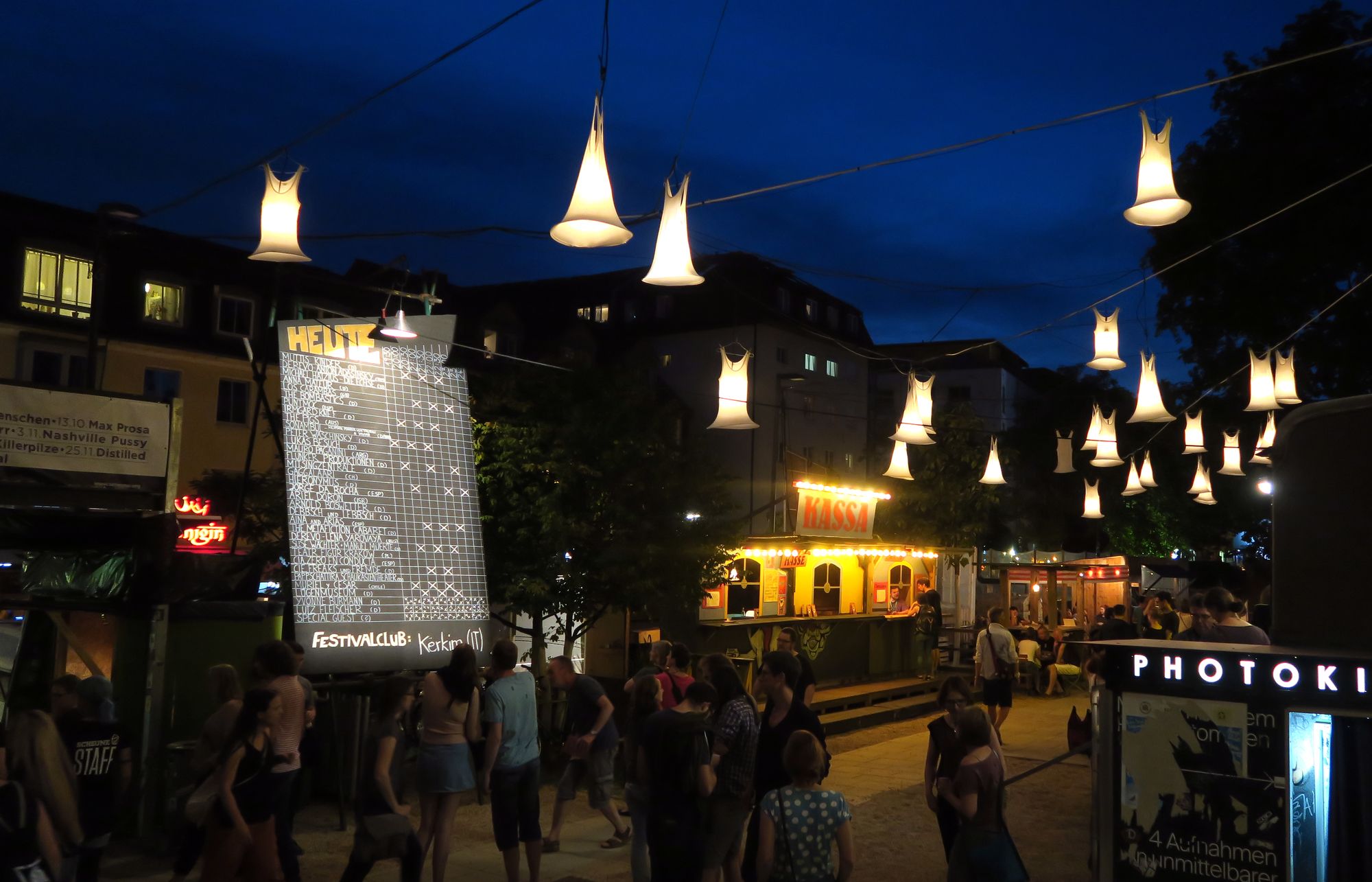 Großartig: Muttis KinderIm großen Scheune-Saal geht es los. Zwei Herren, eine Dame, ein Mikrofon. Ausdrucksstarke Mimik, zurückhaltende Gestik und toller Sound aus drei Mündern, Hörprobe hier. Begeistert taumle ich aus dem Saal, inzwischen ist es dunkel. Die Regenschirm-Deko leuchtet eindrucksvoll im Nachthimmel, ein Absacker und der erste Buden-Abend ist Geschichte.