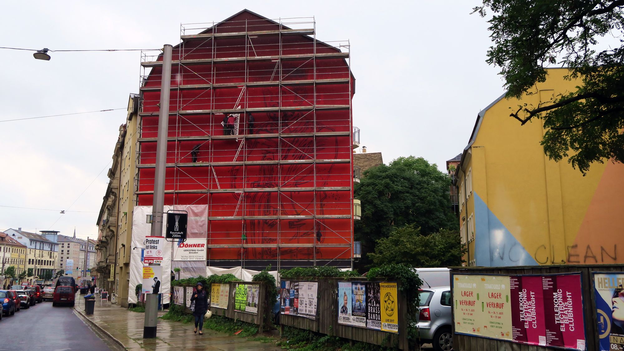 Die knallrote Wand und der „dezente“ Hinweis auf den Hopfentrunk sind allerdings nur vorübergehend geplant. In ein paar Wochen soll die Hauswand dann eine neue Gestaltung bekommen.
