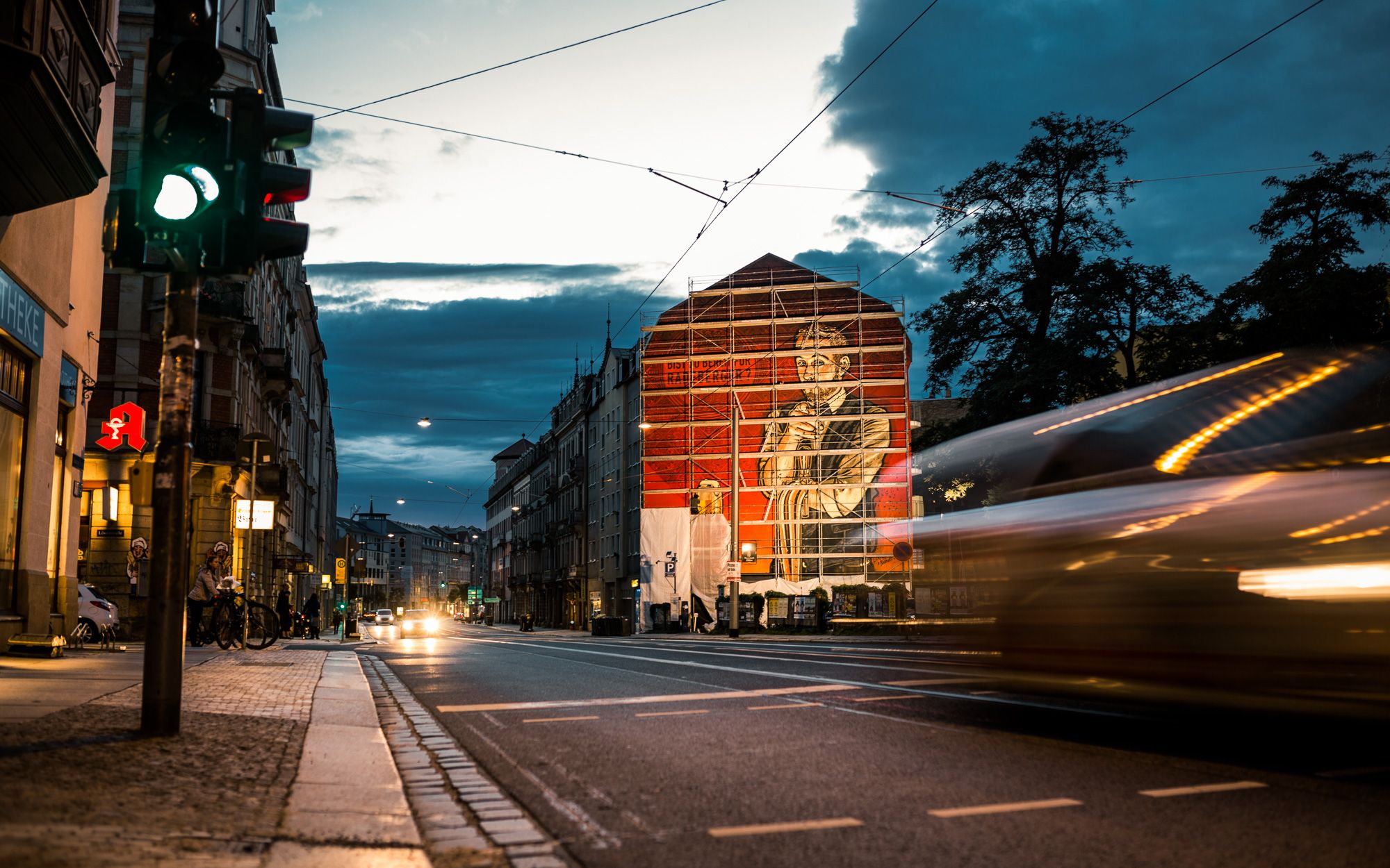 An der Bautzner Straße, Ecke Pulsnitzer, ist seit dem Wochenende ein riesige, knallrote Fassadengestaltung zu sehen. Ziemlich prominent wirbt ein Bierbrauer aus der Region auf dem Bild.
