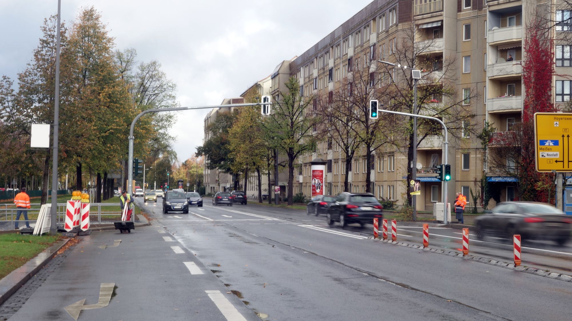 Seit heute Morgen ist die neue Ampel an der Albertstraße auf Höhe Archivstraße in Betrieb. Sie dient als Ersatz für die abgerissene Fußgängerbrücke und erhöht die Verkehrssicherheit für Passanten. Der Übergang über die Gleisanlagen der Dresdner Verkehrsbetriebe (DVB) ist mit eingeschlossen. Die Rechtsabbiegespur in Richtung Neustädter Markthalle wurde um fünf Meter gekürzt. Die vorhandenen Fahrbahnbreiten bleiben erhalten. Die Arbeiten kosteten rund 120 000 Euro.