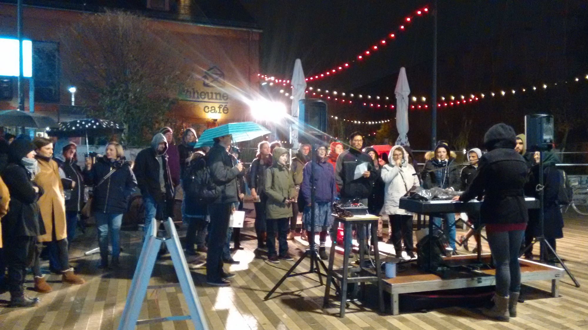 Chor Spontan vor der Scheune – Foto: Ulla W.Vor der Scheune trafen sich gestern Abend ein gutes Dutzen Leute zum „Chor Spontan“. Unter Anleitung der Dirigentin Anja Schumann übten sie ein Lied. Die Stimmung war trotz ekligem Novemberwetters ziemlich gut. Das kann aber auch am ausgereichten Glühwein gelegen haben.
