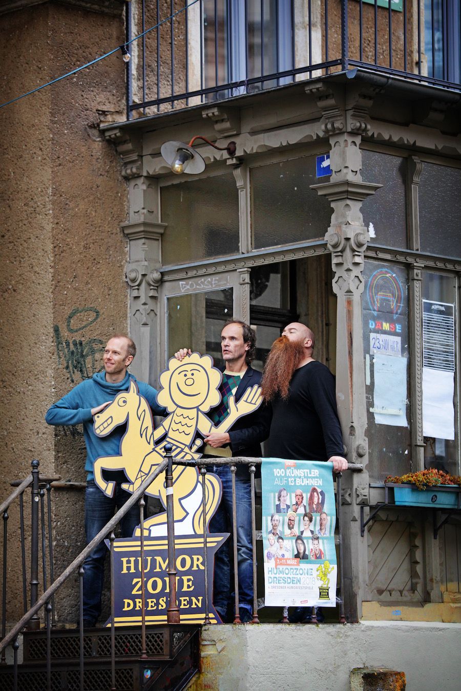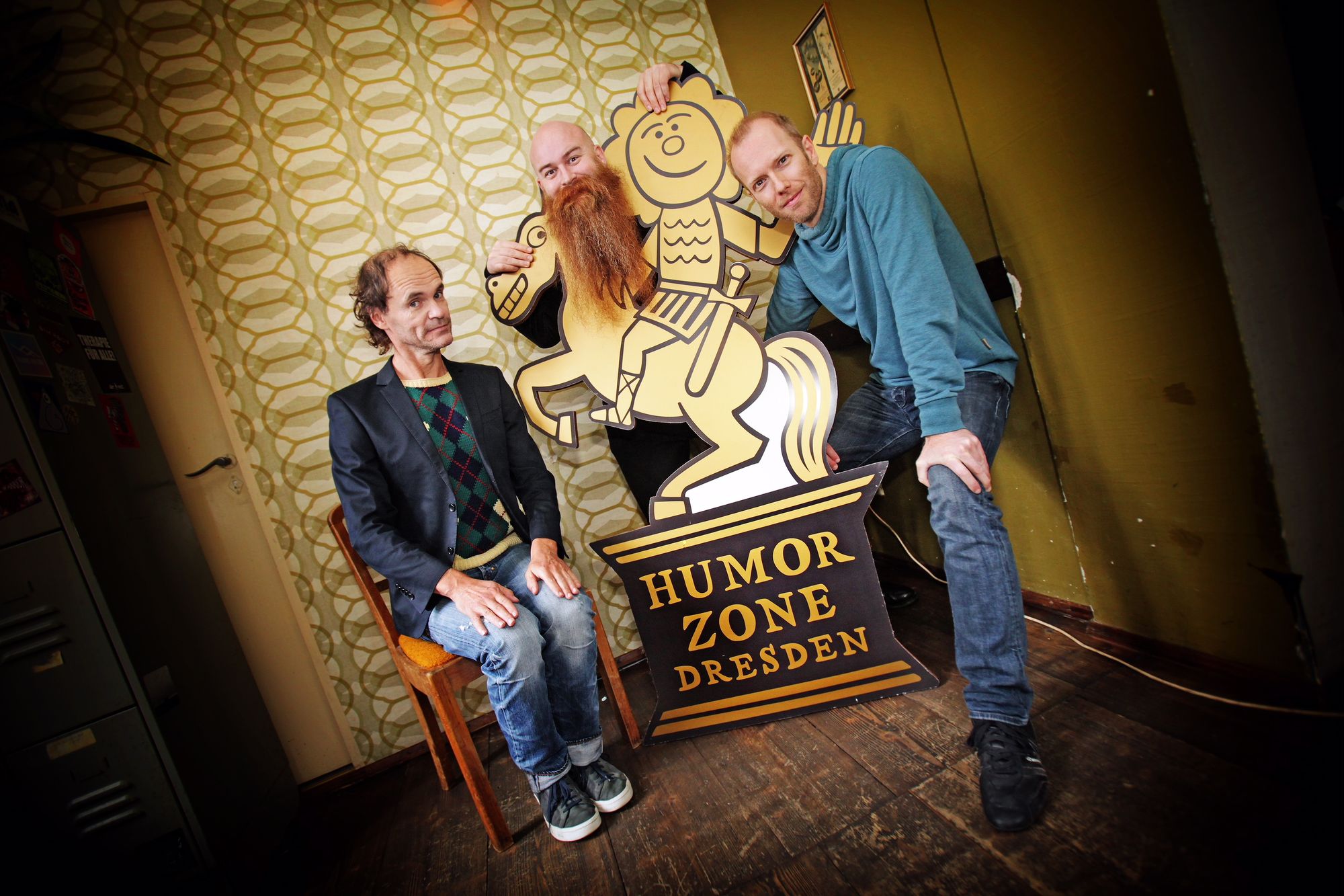 Komödianten: Olaf Schubert, Johnny Armstrong und Michael Krebs im Ostpol, Dresden. Foto: PR/Amac GarbeDas ist ja zum Lachen. Die Humorzone wächst und wächst und das vor allem in der Neustadt. Heute hat der feine Herr Schirmherr, ganz brav mit Jackett überm Pullunder, auf einer fetten Pressekonferenz den Vorverkauf für das Lach-Festival eingeläutet.