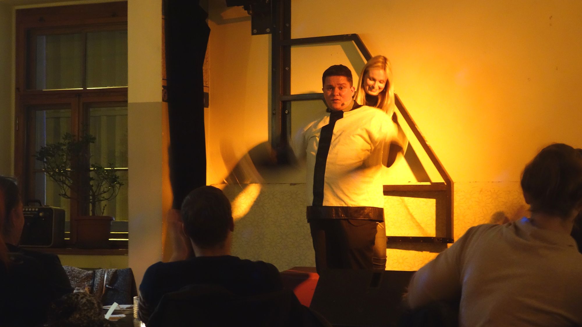 Geschickt spielt er mit dem zweigeteilten Raum. Die Zauber-Tricks mit dem doppelten Seil gehen flüssig von der Hand. Als krönenden Höhepunkt bittet er eine attraktive Anita aus dem Publikum auf die Bühne, die ihn in eine Zwangsjacke einpackt – aus der er sich dann fast wie der große Houdini herauspellt.