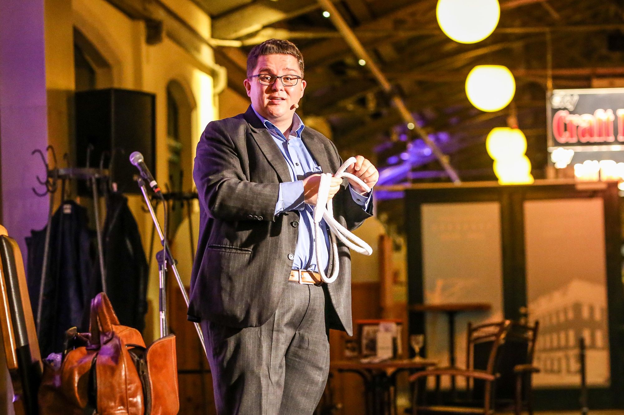 Das Konzept ist einfach. Das Publikum kann es sich in einer Kneipe gemütlich machen und die Komiker pendeln zwischen den einzelnen Lokalitäten. Das ist mir zu einfach. Ich starte im „Alten Wettbüro“ mit einer Ulknudel namens Erasmus Stein. Der hat sich nicht nur in einen schmucken Anzug geworfen sondern hat auch gleich ein Seil dabei. Na, wenn das nicht fesselnd wird.
