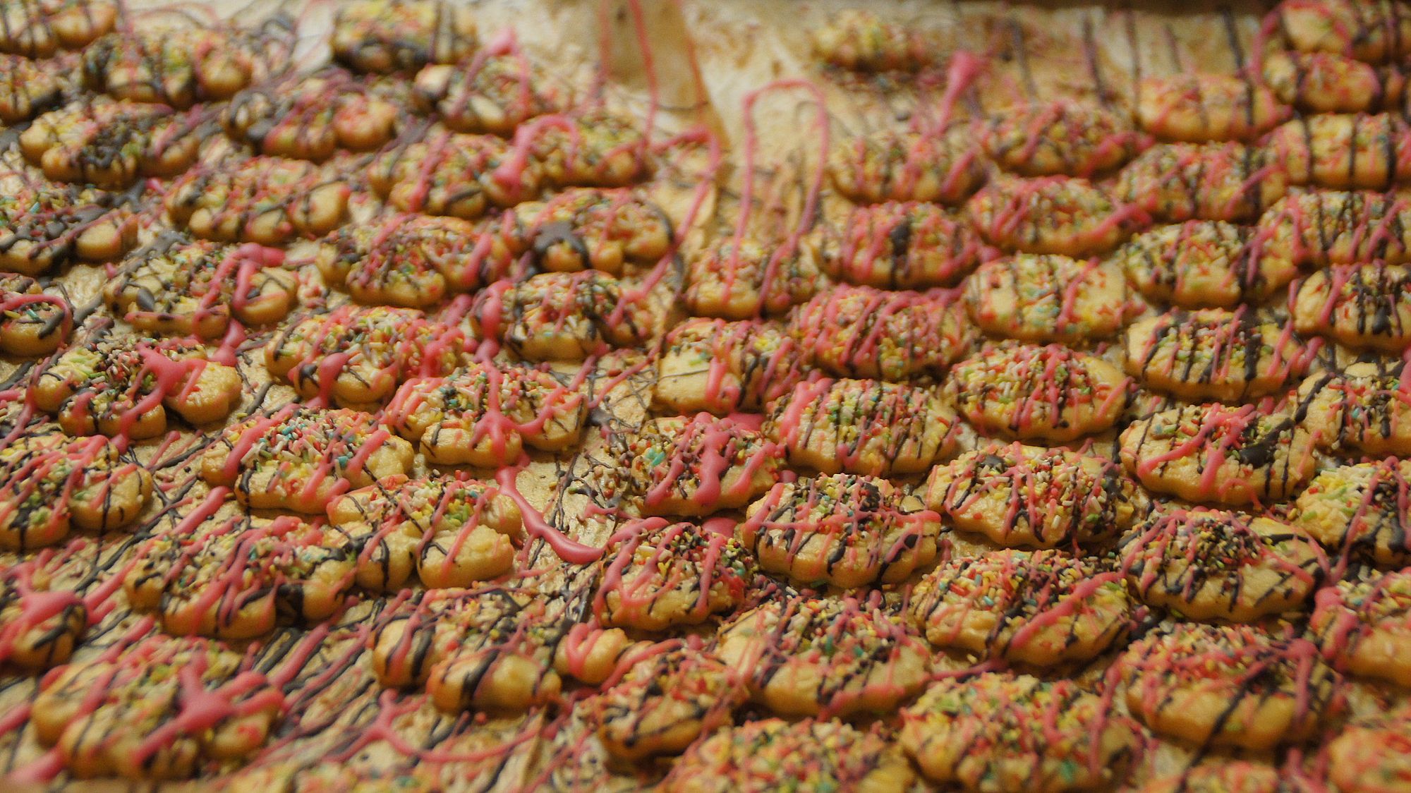 In den Hinterräumen der Bäckerei Rißmann auf der Königsbrücker Straße stapeln sich die Stollenkartons. „Mandelstollen“, erklärt der Meister, „besonders empfindlich. Wir benutzen keine Konservierungsstoffe.“ Ein Grundpfeiler der Weihnachtszeit ist Gebäck. Es gehört zur weihnachtlichen Romantik wie der Tannenbaum und das Räuchermännchen. Die Arbeit läuft auf Hochtouren. Auf großen Blechen warten bunt bespritzte Kekse auf ihre Trocknung.
