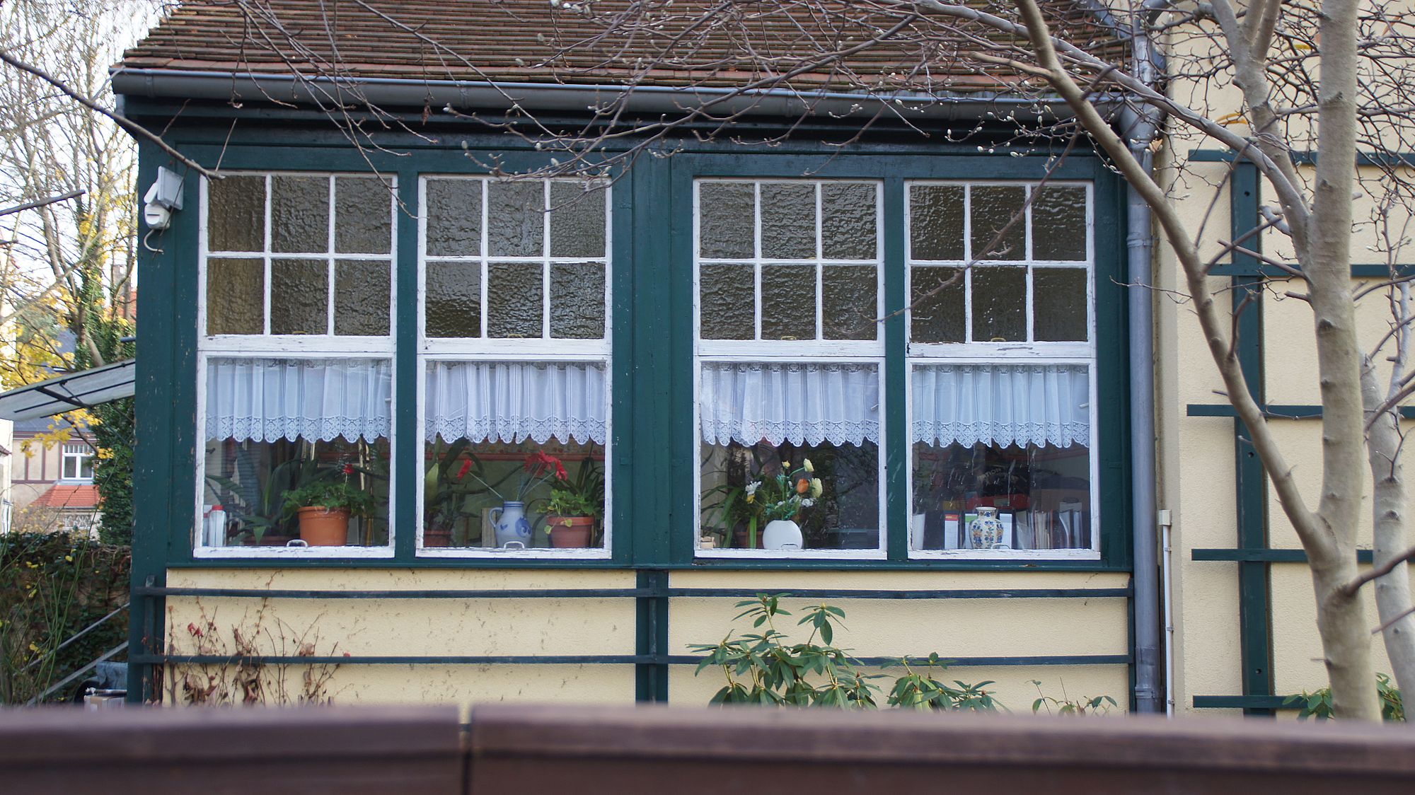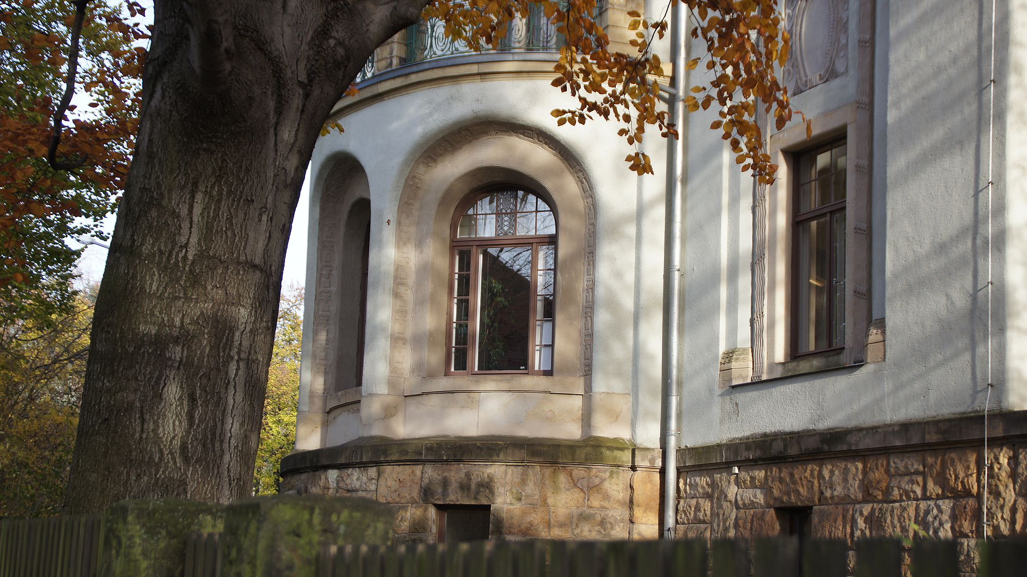 So viel zum Konfliktpotential. In Beschaulichkeit steht die Clarastraße der Bettinastraße in Nichts nach. Verträumte Schlösschen, Gärten wie gerahmt. Auf den Gehwegen wurden noch keine Laubbläser von der Kette gelassen. Sie liegen voll raschelnder Blätter, vom Herbst verschwenderisch gefärbt. Ab und an fällt eines wie von weit her aus einem Rilkegedicht. Es könnten dieselben Bäume sein, die Clara … Nein!