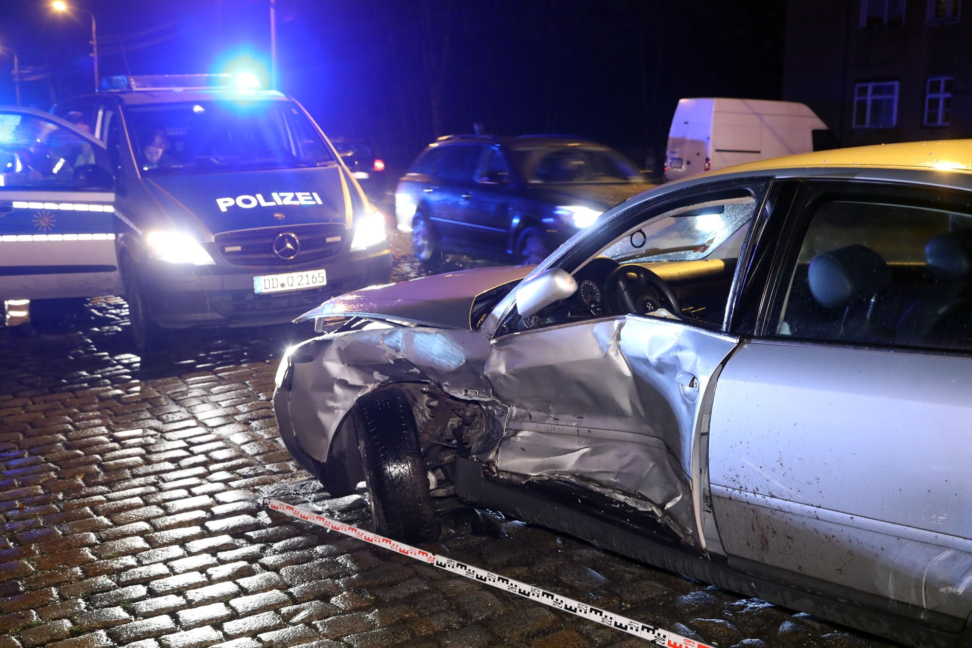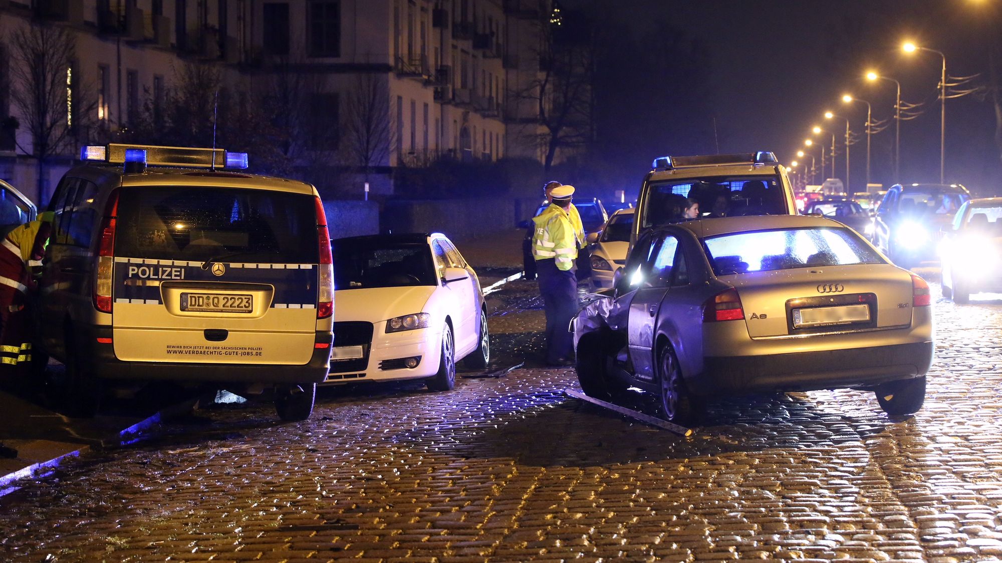 Wie die Dresdner Polizei heute (6. Dezember) mitteilte, befuhr der Funkwagen Mercedes Vito (Fahrer 41 Jahre alt) mit Sondersignal die Stauffenbergallee in Richtung Königsbrücker Straße. Dabei fuhr der Streifenwagen an einer Fahrzeugkolonne vorbei. In der Folge kam von rechts, durch einer Lücke in der Kolonne, ein Audi A6 gefahren, und wollte offenbar wenden. Es kam zum Zusammenstoß des Funkwagens mit dem Audi. Der Mercedes wurde zudem gegen einen am linken Fahrbahnrand parkenden Audi A3 geschleudert.