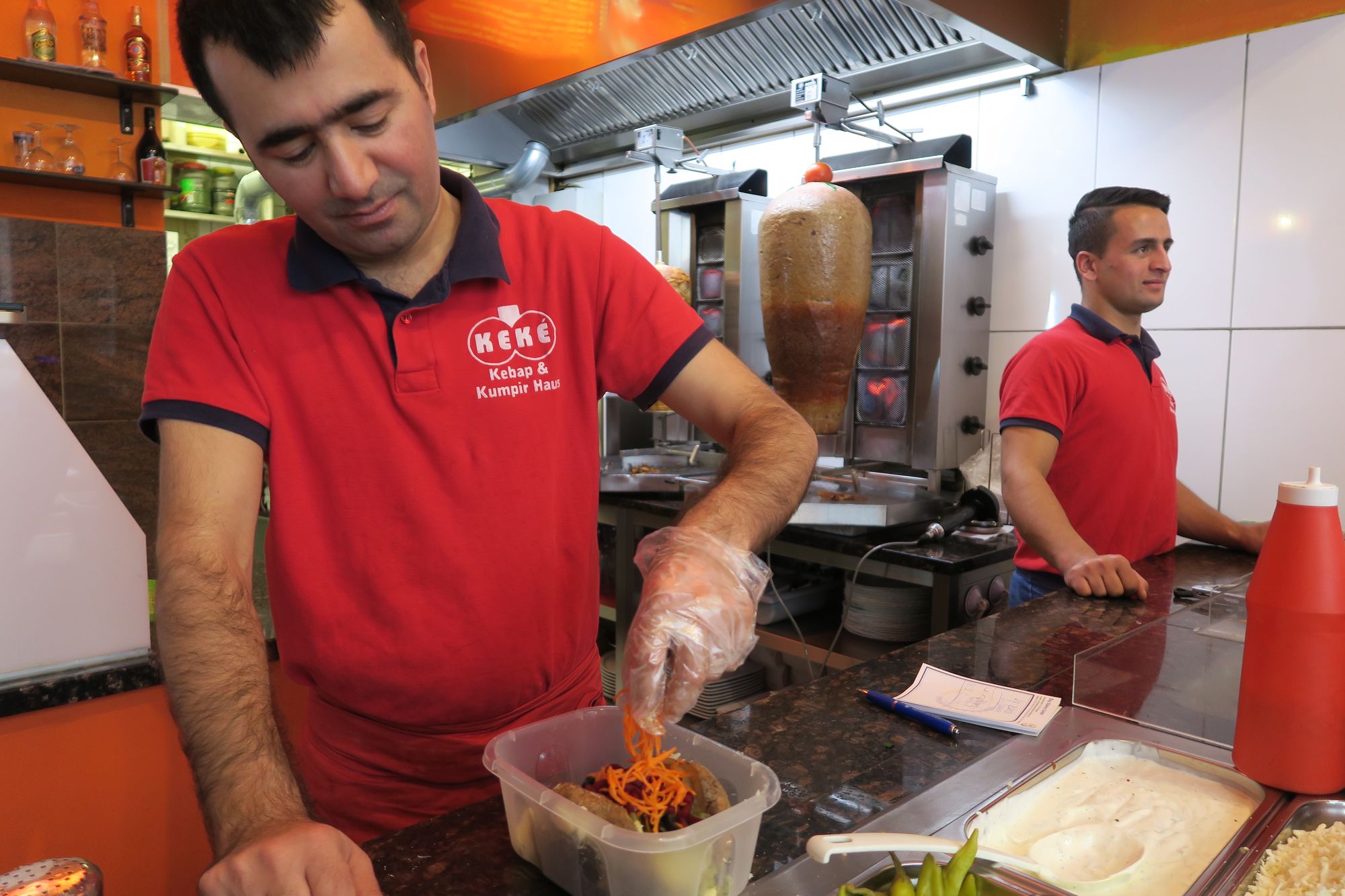 In beiden Fällen handelt es sich um Recyclingmaterial, erläutert Kazim, der das Kekè vor elf Jahren übernommen hat. „Anfangs habe ich noch ganz allein im Laden gestanden, heute beschäftige ich fünf Mitarbeiter“, erzählt er. Der Laden läuft mittags und abends. Auch wenn ihm vor Kurzem sehr einträgliche Kundschaft abhanden gekommen ist. Die Feuerwehrleute waren fast jeden Tag hier, jetzt kommen sie aber immer noch einmal pro Woche.