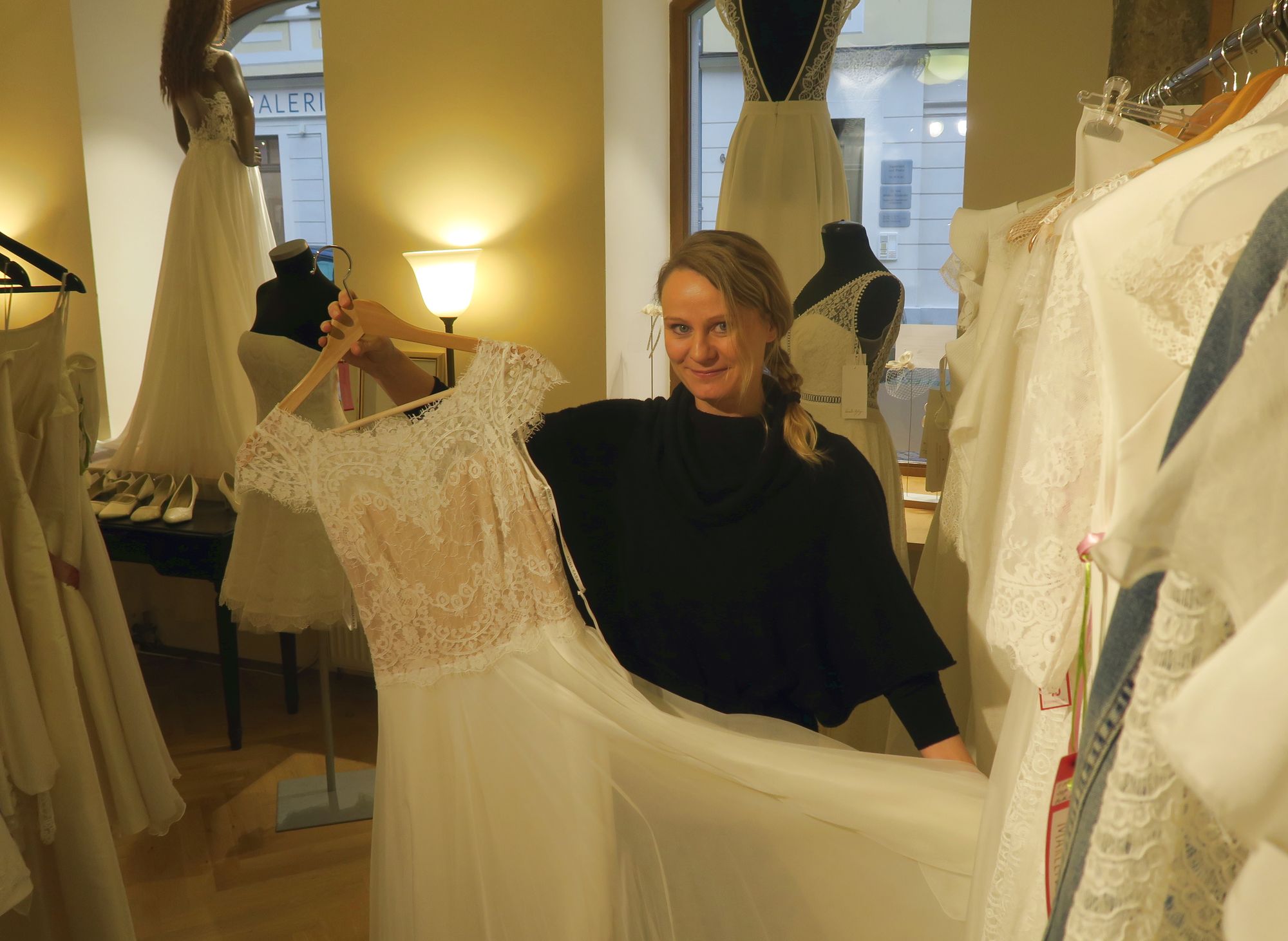 Mit dem Umzug 2004 in das Barockviertel wandelte sich auch das Angebot. Heute gibt es nur des Kontrastes wegen mal was Schwarzes. Die überwiegende Farbe ist weiß, oder wie sie es ausdrücken würde: „Creme, Champagner, Vanille und Muschel – reines Weiß trägt heute niemand mehr“. Sie schmunzelt und erzählt gleich eine Geschichte, wie eine Braut mal auf reinweiß bestanden habe und dann vom Ergebnis erschrocken war.