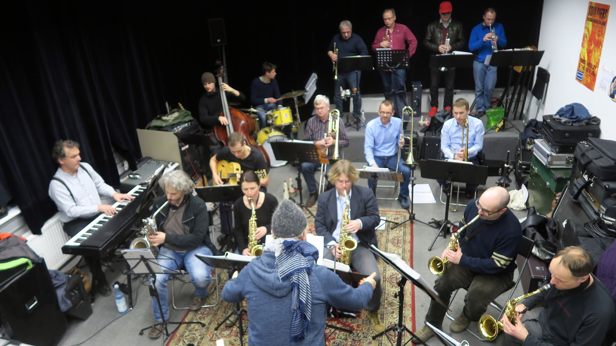 Das „New Town Swing Orchestra“ hat mich zu einer Probe eingeladen und ich hab mich dummerweise verspätet. Jetzt steh ich hier im Dunkeln. Aha, da hinten muss es sein. Prompt geht eine Tür auf und ein ganzer Schwung Blasmusik strömt mir entgegen – „Summertime – and the livin is easy“ – da reibe ich mir doch erfreut die frostigen Hände.