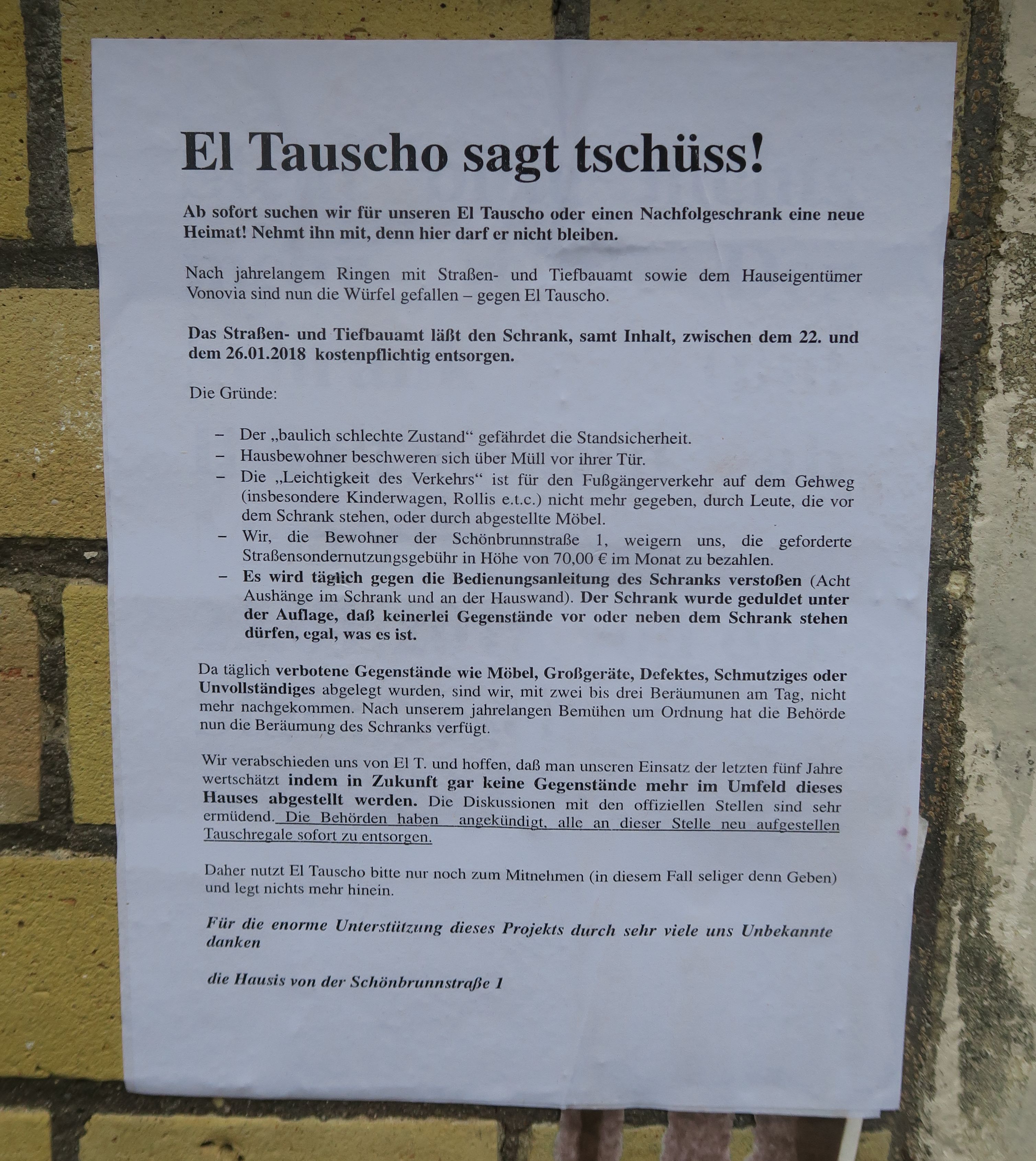 Diese Woche griff das Ordnungsamt nun durch und beauftragte die Stadtreinigung mit der Entfernung der Tauschschränke. Die Anwohner der Schönbrunnstraße bitte in ihrem Aushang darum, das Engagement der vergangenen Jahre dadurch zu würdigen, dass man an der Ecke keine Gegenstände mehr abstellt.