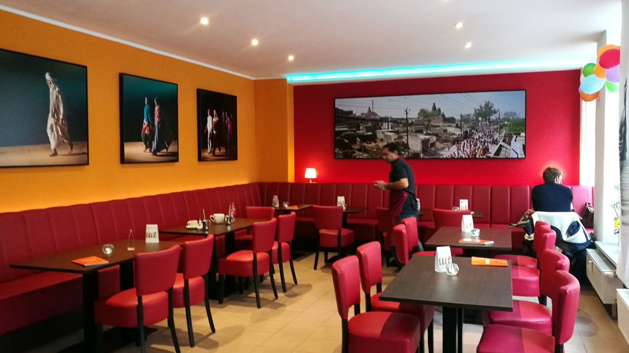 Ich konnte mir es gar nicht vorstellen. Früher standen hier Regale, voll mit Computerspielen. Hauptkundschaft: Jungs mit schwarzen Kapuzen-Shirts. Und nun ein indisches Restaurant. Der erste Eindruck: soo indisch ist das hier gar nicht. Wenn man es zum Beispiel mit dem Jaipur oder dem Maharadscha vergleicht. Das Lokal ist ziemlich schlicht gehalten. Orange und rot dominieren den Raum. Stylische Ledersofas, schlichte Tische, große Bilder. Nun, die zumindest zeigen indisches Leben.