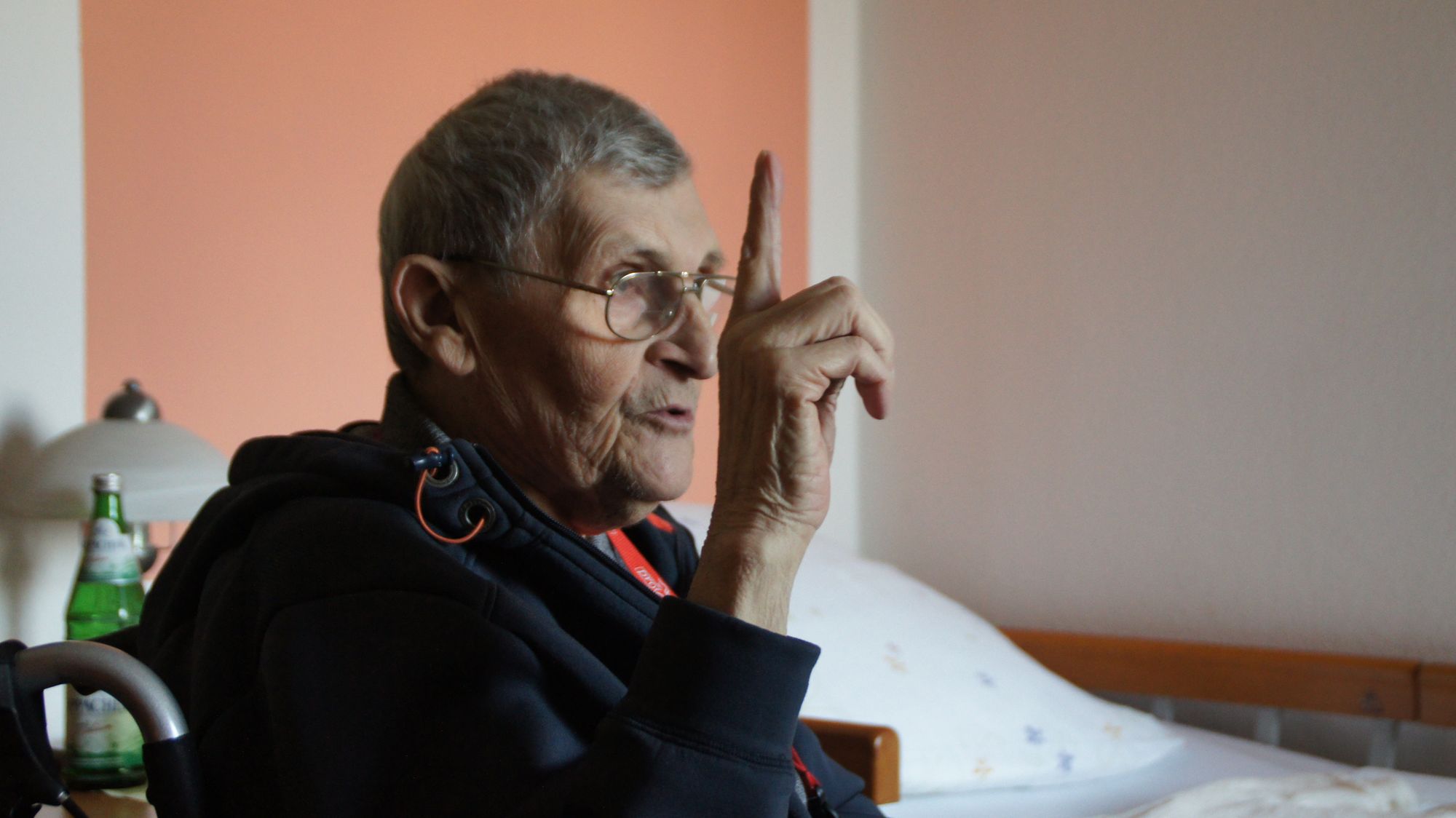 Lothar Kempe sitzt in seinem Rollstuhl und versucht die Gedanken zu haschen. Sie schwirren umher wie Vögel, huschen durchs Dickicht, verstecken und verwandeln sich. Die Orte purzeln durcheinander, die Zeit verschwimmt. Er schaut ratlos aus dem Fenster, beschreibt Bilder, Versatzstücke von Sätzen, Geschichten. „Ich weiß nicht, was ich von mir selber halten soll“, sagt er. Der Stuckateur baute nach dem Krieg Hof- und Kreuzkirche wieder mit auf.