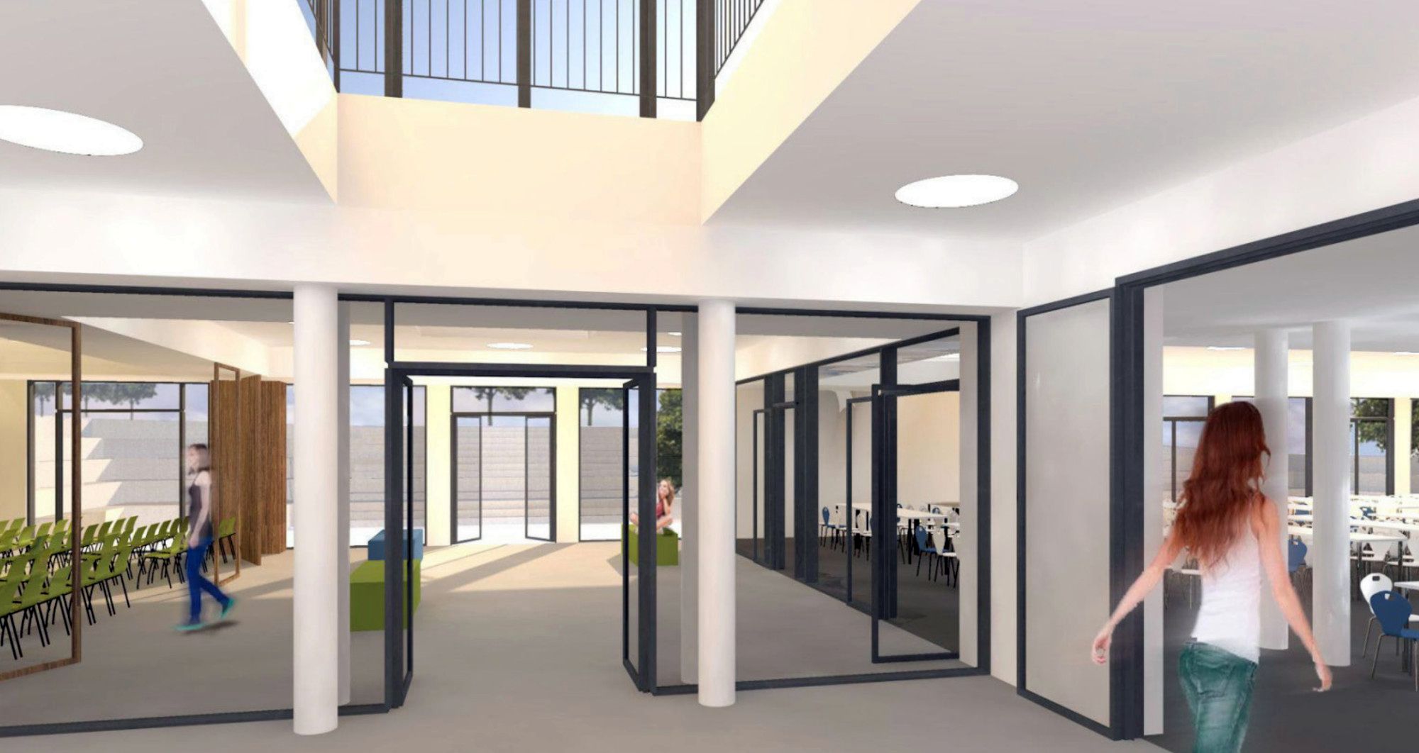 Der Hof wird künftig in unterschiedliche Zonen gegliedert. Einen Wirtschaftsbereich mit Müllplatz und Stellplätzen, einen Sportbereich mit Weitsprunganlage und Tischtennisplatten und einen Pausenhof mit Ruhe- und Bewegungszonen. Wegen des Mensa-Neubaus wurden Bäume im Hof gefällt (Neustadt-Geflüster 3. Februar 2018), Neupflanzungen sind geplant. Die neue Dachterrasse erhält unter Sonnensegeln Sitz- und Lümmelelemente. Im Mai 2020 soll die Rekonstruktion des Hauses A fertig sein, die Arbeiten an Haus B sollen voraussichtlich 2021 abgeschlossen sein. Die Gesamtkosten für die Sanierung des Schulstandortes betragen rund 18 Millionen Euro. Davon entfallen auf Haus A rund 9,5 Millionen Euro.