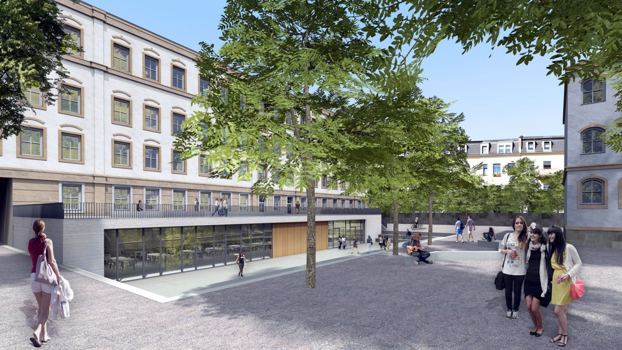Das 1894 eingeweihte Haus A dominiert die Louisenstraße. Äußerlich wird fast nichts verändert, aber der historische Haupteingang soll stärker betont werden, so Schmidtgen. Auch die Räume im Innern bleiben im wesentlichen erhalten. Neu sind zwei Fluchttreppenhäuser, ein Aufzug und eine Mensa zur Hofseite. Deren Dach wird dann begehbar sein.