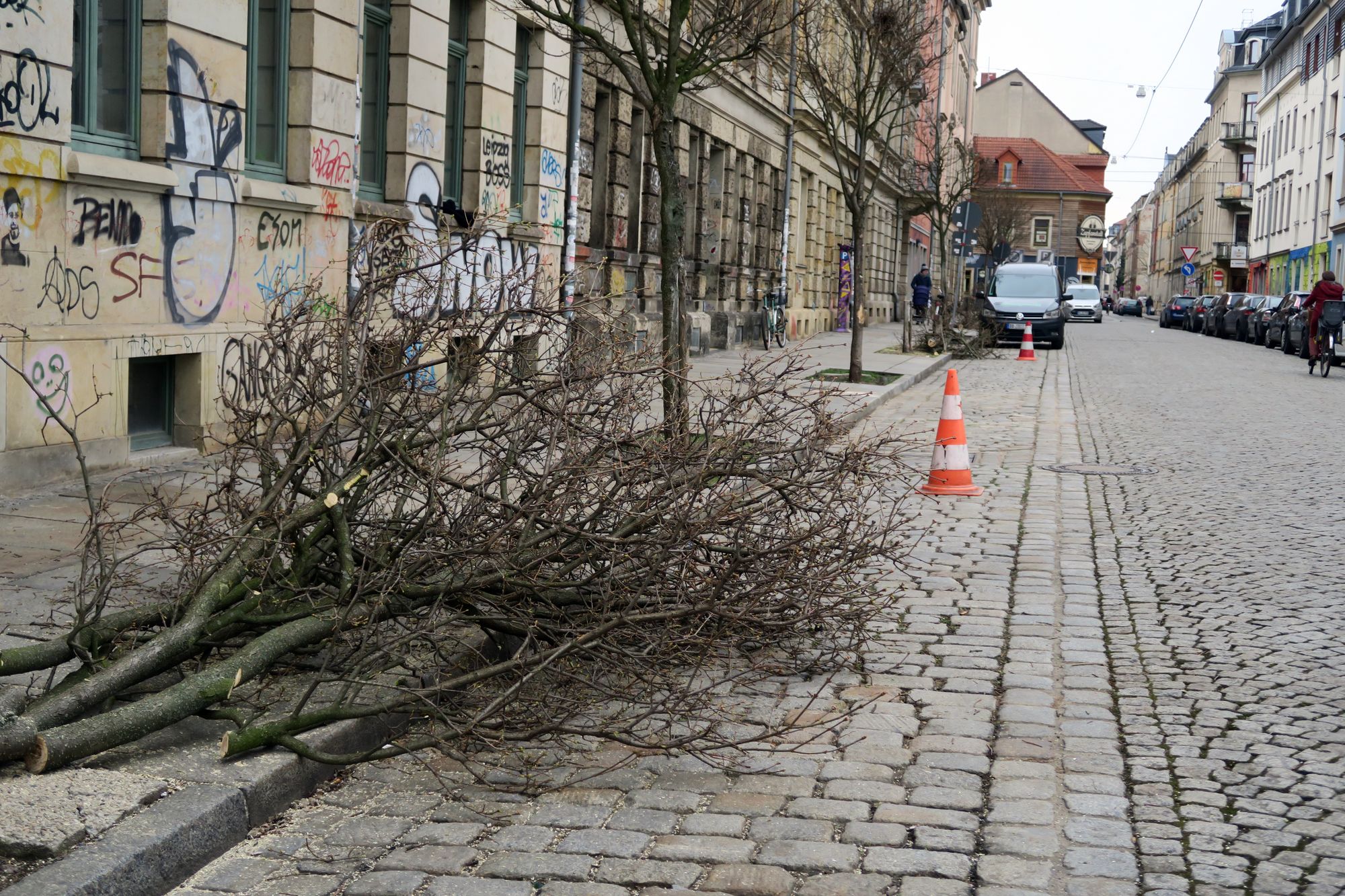 Auf der Sebnitzer Straße wurden gestern drei Bäume gefällt. Anke Hoffmann vom Presseamt der Stadt erklärte, dass die Bäume starke Rinden- und Holzschäden haben, zum Teil von Pilzen befallen sind und teilweise am Stamm morsch sind.