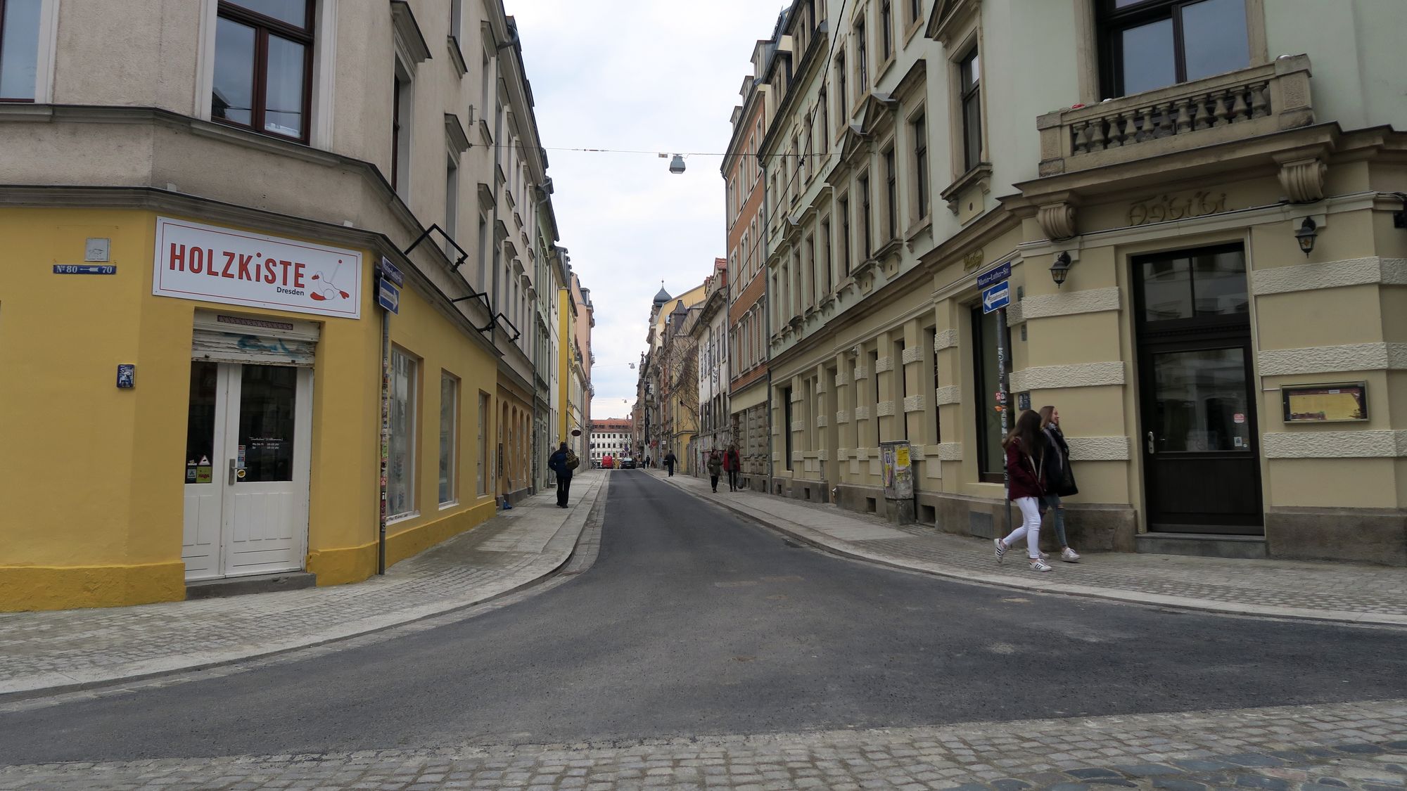 Eigentlich sollten die Arbeiten hier schon Ende Januar abgeschlossen sein, aber die gesamte Baustelle rund um den Martin-Luther-Platz hatte sich immer wieder verzögert. Kurz vor Weihnachten war dann die Pulsnitzer fertig, nun also pünktlich zum Osterfest die erst kürzlich temporär umbenannte Martin-Luther-Straße.