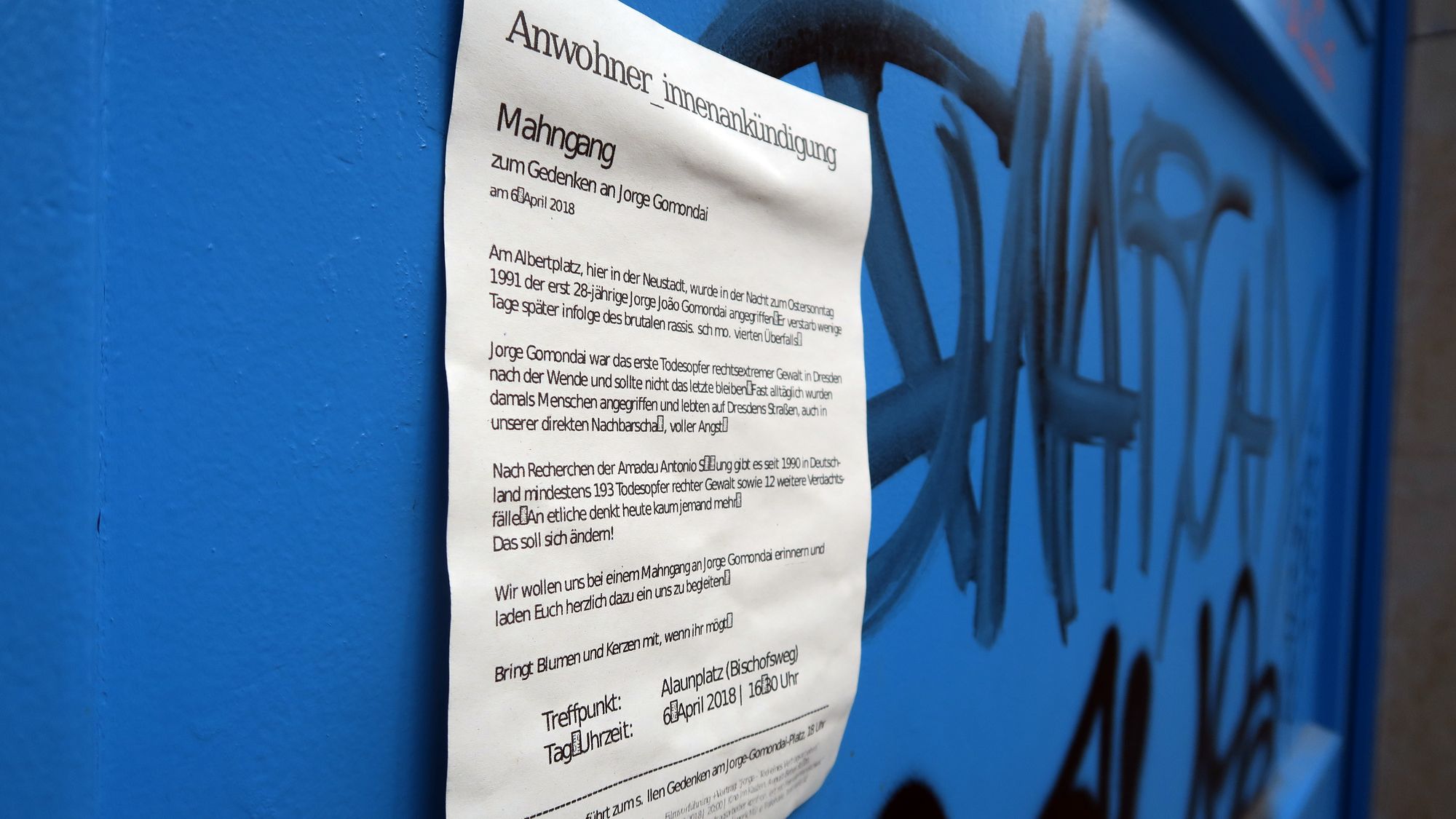 „Bringt Blumen und Kerzen mit, wenn ihr mögt“, heißt es weiter. Treffpunkt soll um 16.30 Uhr am Alaunplatz (Bischofsweg) sein, von dort soll der Mahngang dann zum Albertplatz, bzw. Jorge-Gomondai-Platz führen. Dort veranstaltet schon ab 16 Uhr die Dresdner SPD-Fraktion ein Fotoprojekt unter dem Titel „Bunter Faden für Toleranz und Menschlichkeit“. Ab 18 lädt der Ausländerrat Dresden zum Stilles Gedenken an Jorge Gomondai mit Blumenniederlegung.