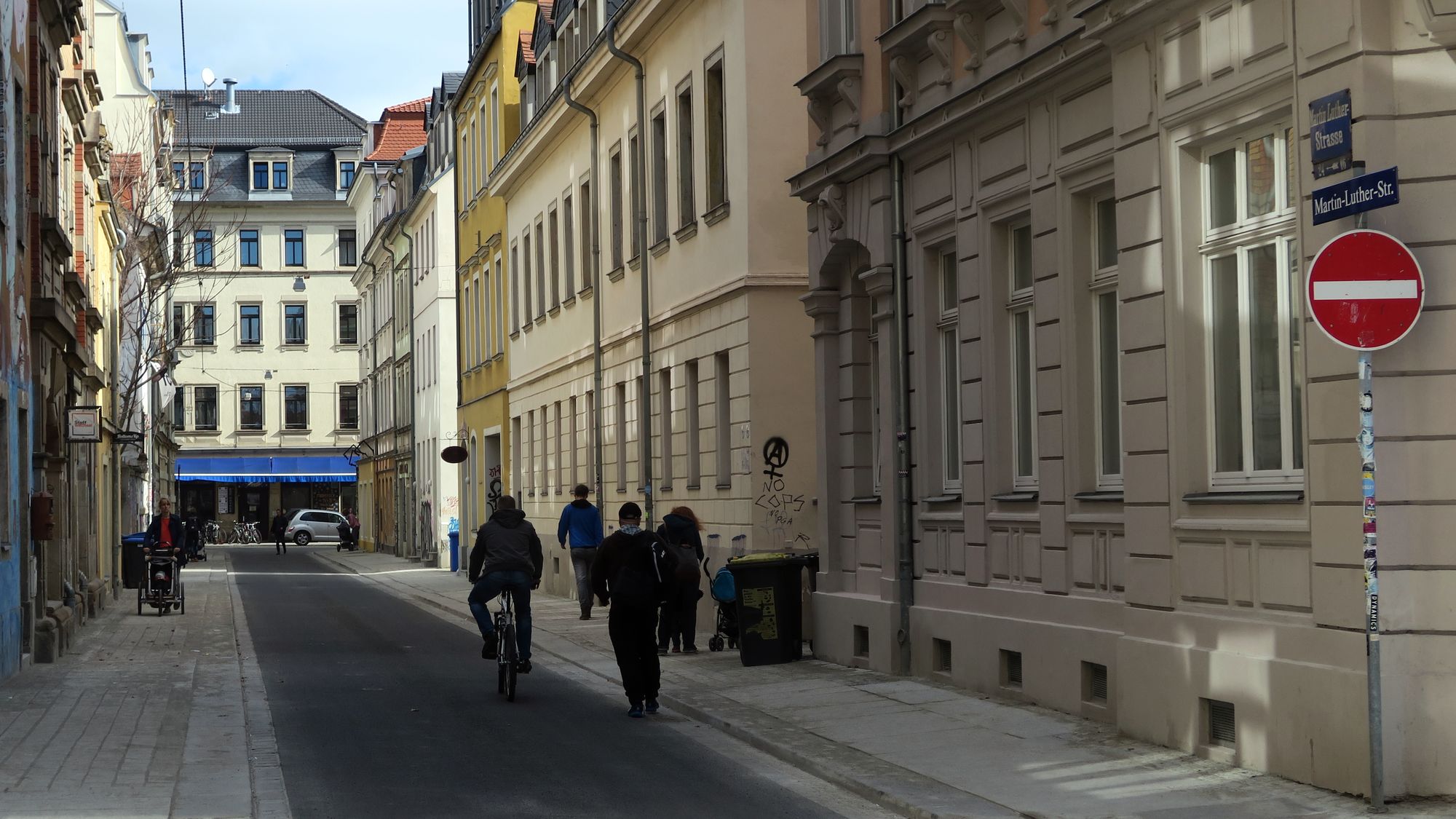 Also: Mit dem Rad vom Martin-Luther-Platz zur Louisenstraße geht es nur im Schiebeverkehr oder eben über die Pulsnitzer, die ist in beiden Richtungen befahrbar.