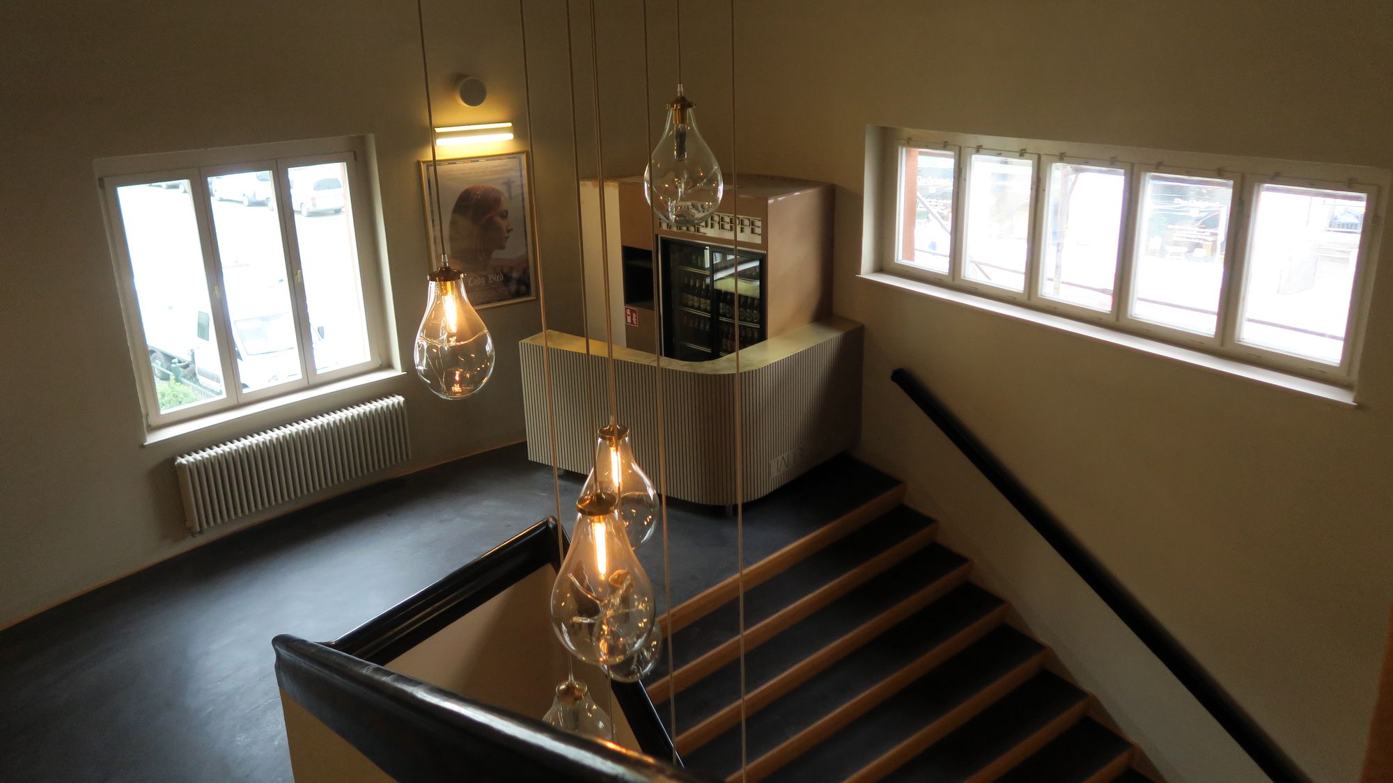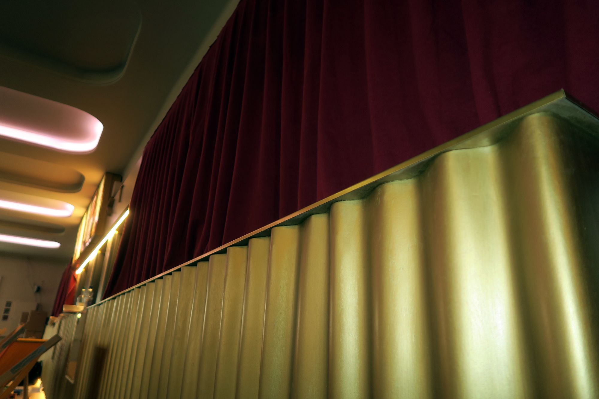 Goldenes Holz im Foyer.Das neue Foyer kommt sehr edel daher. Der Tresen ist mit gebogenem, vergoldetem Holz verkleidet, darüber schmiegt sich weinrotes Velour. „Das Ocker-Orange der Treppenstufen entspricht dem Original-Farbton“, erklärt Architekt Hendrik Neumann. Dann zeigt er auf die Lampen an der „Halben Treppe“: „Das sind Unikate, handgefertig, jede ist anders“.Lampenkunst im Treppenhaus