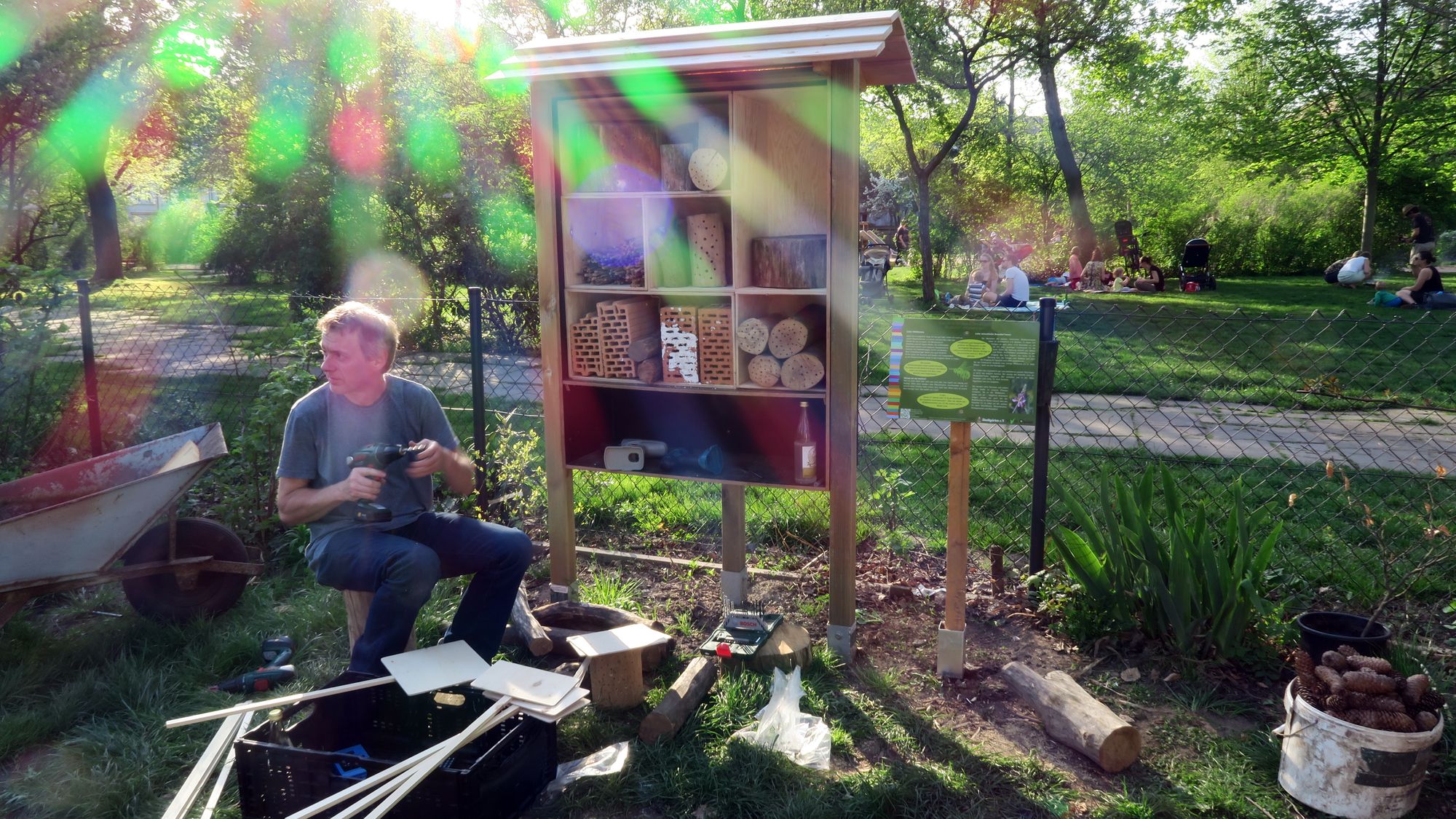 In einem gemeinsamen, von der Naturstiftung David finanzierten Projekt planten und bauten der Bund für Umwelt und Naturschutz Deutschland (BUND) Dresden und der Stadtgärten e.V., der einen Gemeinschaftsgarten auf dem Alaunplatz betreibt, eine Nisthilfe für Wildbienen.