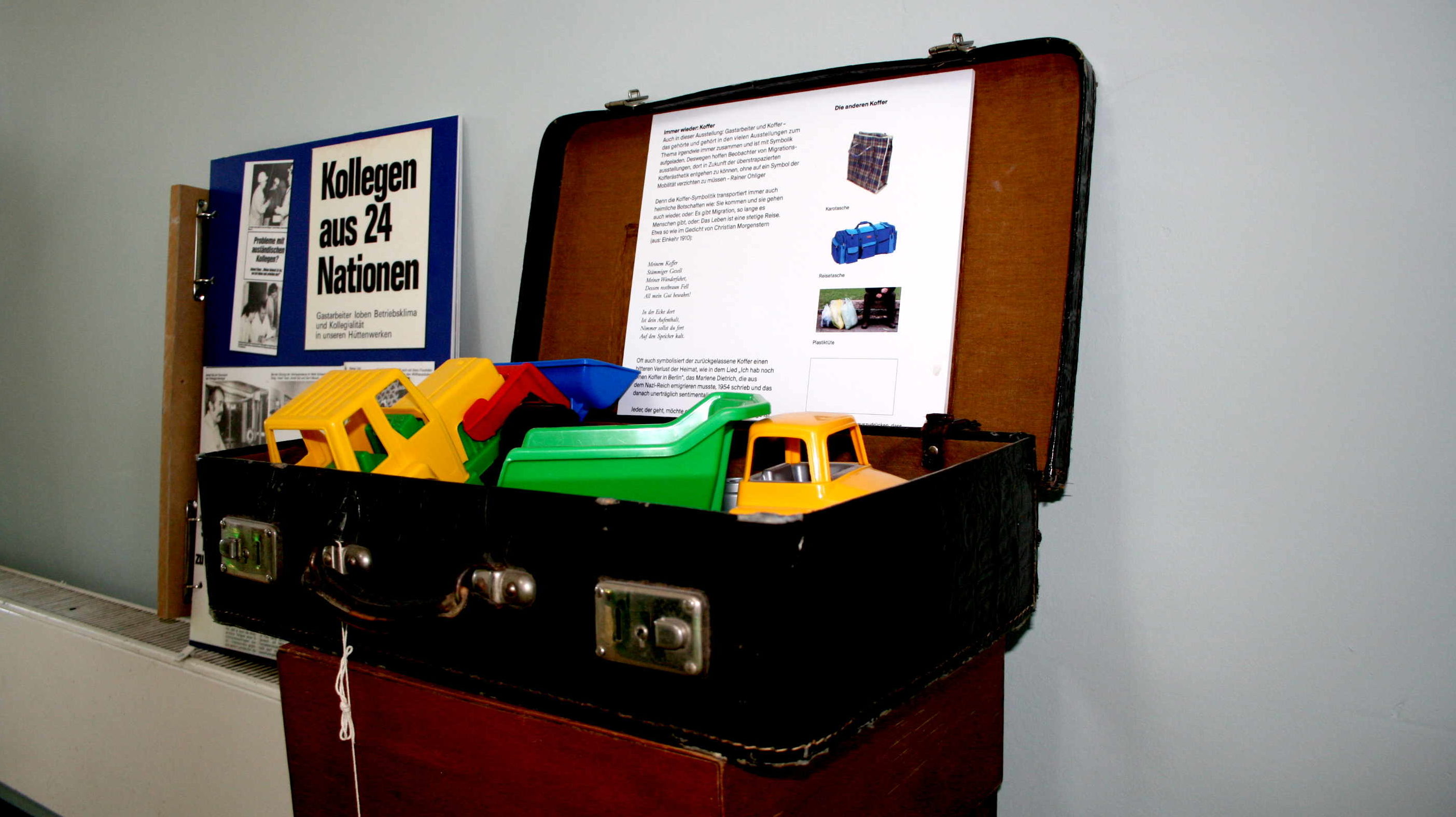 Die Besucher werden im ersten Teil der zweietagigen Ausstellung anhand Hasans Lebensgeschichte durch die Welt der Migration geführt. Fragen der Ankunft, des Heimwehs und des Fremdseins werden thematisiert. Doch nicht nur die Migration an sich ist vielfältiger geworden – auch neue Kinder sind nachgekommen – die Generation der Enkel.