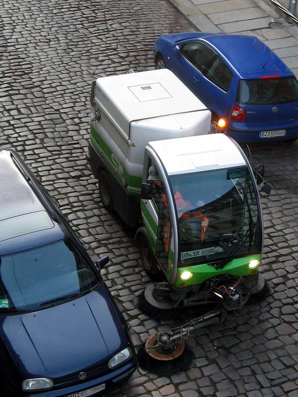 Inzwischen ist ein kleiner Konvoi an Reinigungsfahrzeugen an mir vorbei gebraust. Die Stadtreiniger machen das geschickt, kleine Trupps, bewaffnet mit Besen und Schaufeln, ziehen über die Fußwege, kehren die Ecken aus und klauben die hartnäckigsten Müllreste auf. Vor ihnen bürstet das kleine, wendige Gefährt mit den zwei runden Besen flink um jede Ecke und jedes Straßenschild. Neben ihm brummt und schrubbt der große Bruder auf der Straße. Wenn er vorüberzieht, staubt nichts, die Straße wird schön mit eingefeuchtet. Hinter sich lässt er einen fast glänzenden Streifen wunderbar sauberen Asphalts. Noch im Laufe des Vormittags ist die Neustadt wieder auf Hochglanz poliert.
