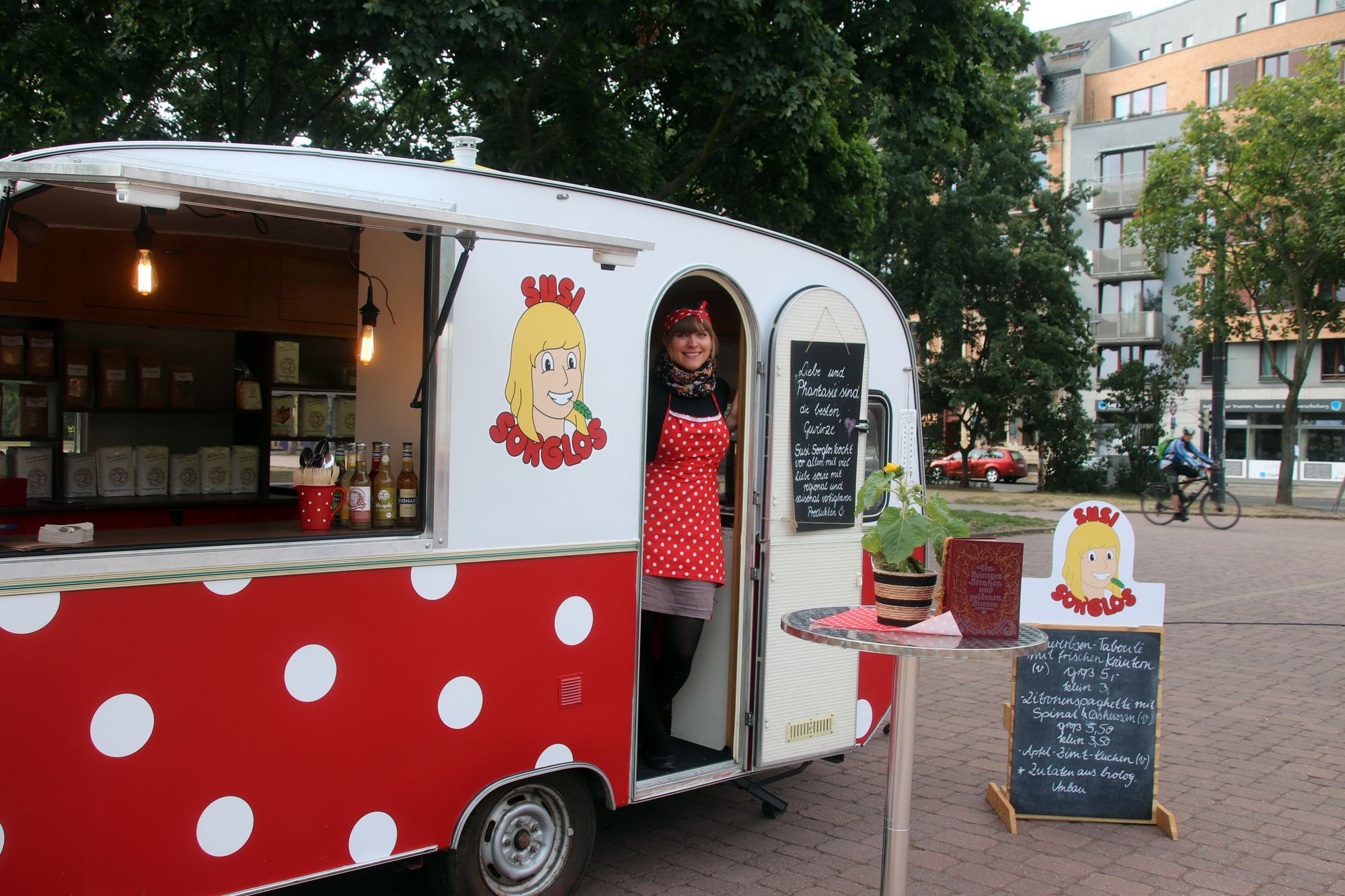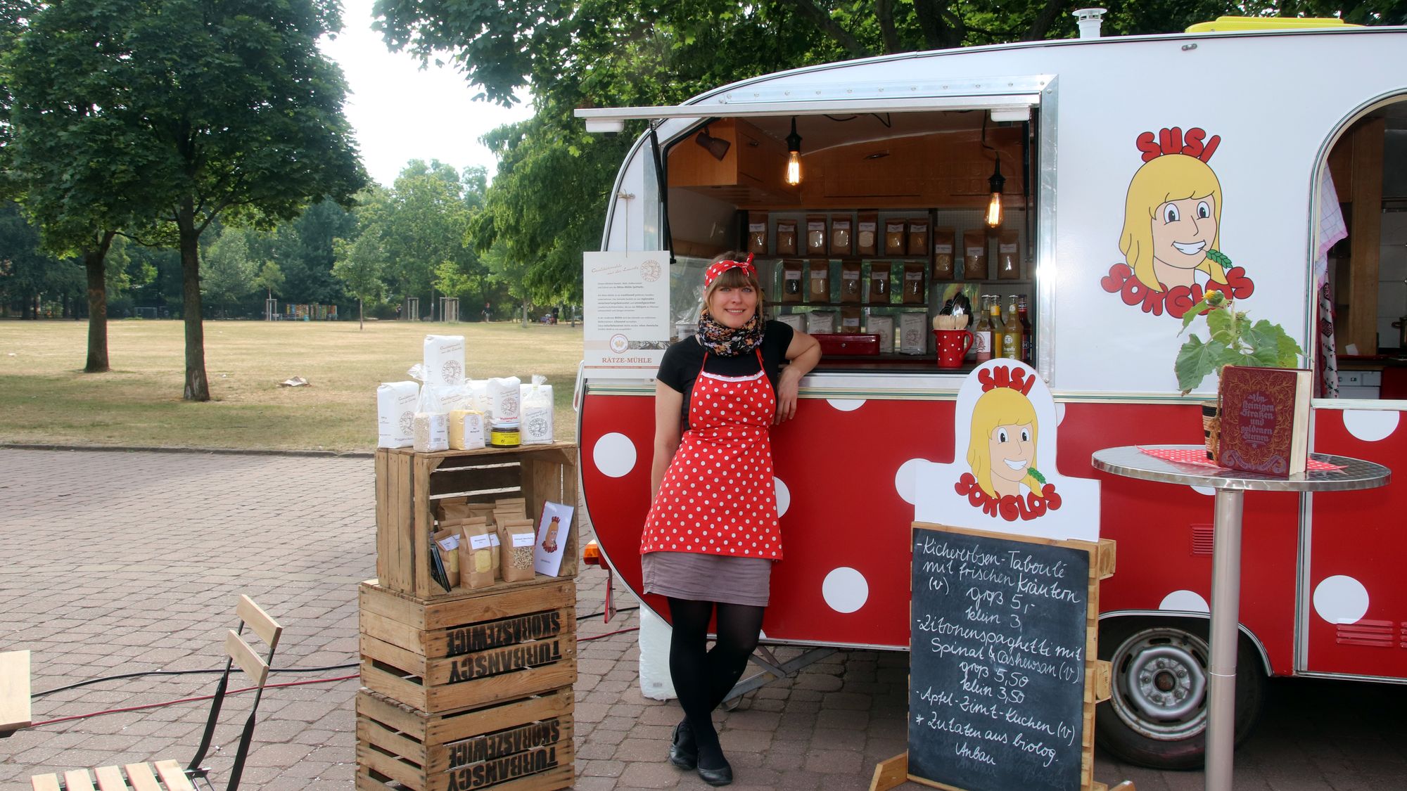 Susi Sorglos heißt eigentlich Susann Kossatz und eigentlich hat sie auch mal studiert und müsste eigentlich in irgendeinem Büro arbeiten. Aber „ich bin leidenschaftliche Köchin“, sagt sie. Dann gab es da diesen 45 Jahre alten Wohnwagen und die Idee mit einem Imbiss-Stand. „Seit ungefähr fünf Jahren lebe ich schon vegan“, erzählt sie und da war klar, wenn sie was zu essen anbietet, dann natürlich ohne tierische Produkte.
