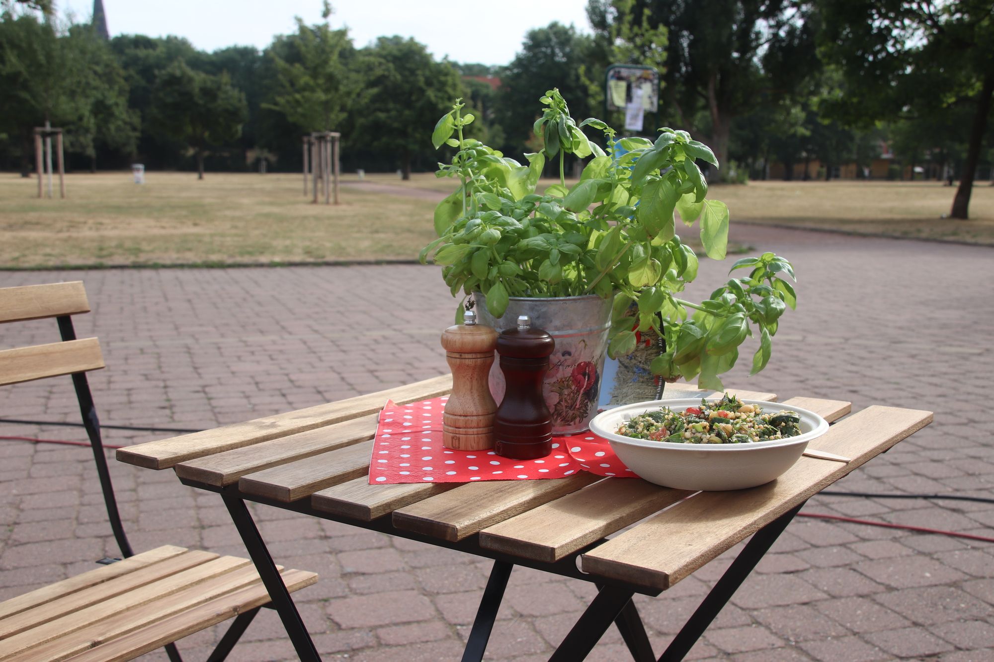 Das Imbiss-Angebot kommt gut an. „Bei mir stehen die Leute zwar noch nicht Schlange, wie an der Gulasch-Kanone nebenan, aber die Nachfrage ist da.“ Die 28-Jährige schmunzelt, die Nachfrage nach den Mühlenprodukten sei auf anderen Märkten größer, aber sie ist optimistisch, dass sie auch die Neustädter überzeugen kann. Und prompt kommt ein junger Mann vorbei. Der kennt die Rätze-Mühle aus der Lausitz und kündigt an, dass er demnächst größere Mengen ordern werde, da er fast jeden Tag selber bäckt. Jetzt strahlt Susi und holt den Taboulé-Salat raus, den soll es heute zum Mittag geben. Im Gegensatz zum libanesischen Original ist bei ihr aber jede Menge Hirse im Salat. Die Petersilie ist nicht ganz so präsent.
