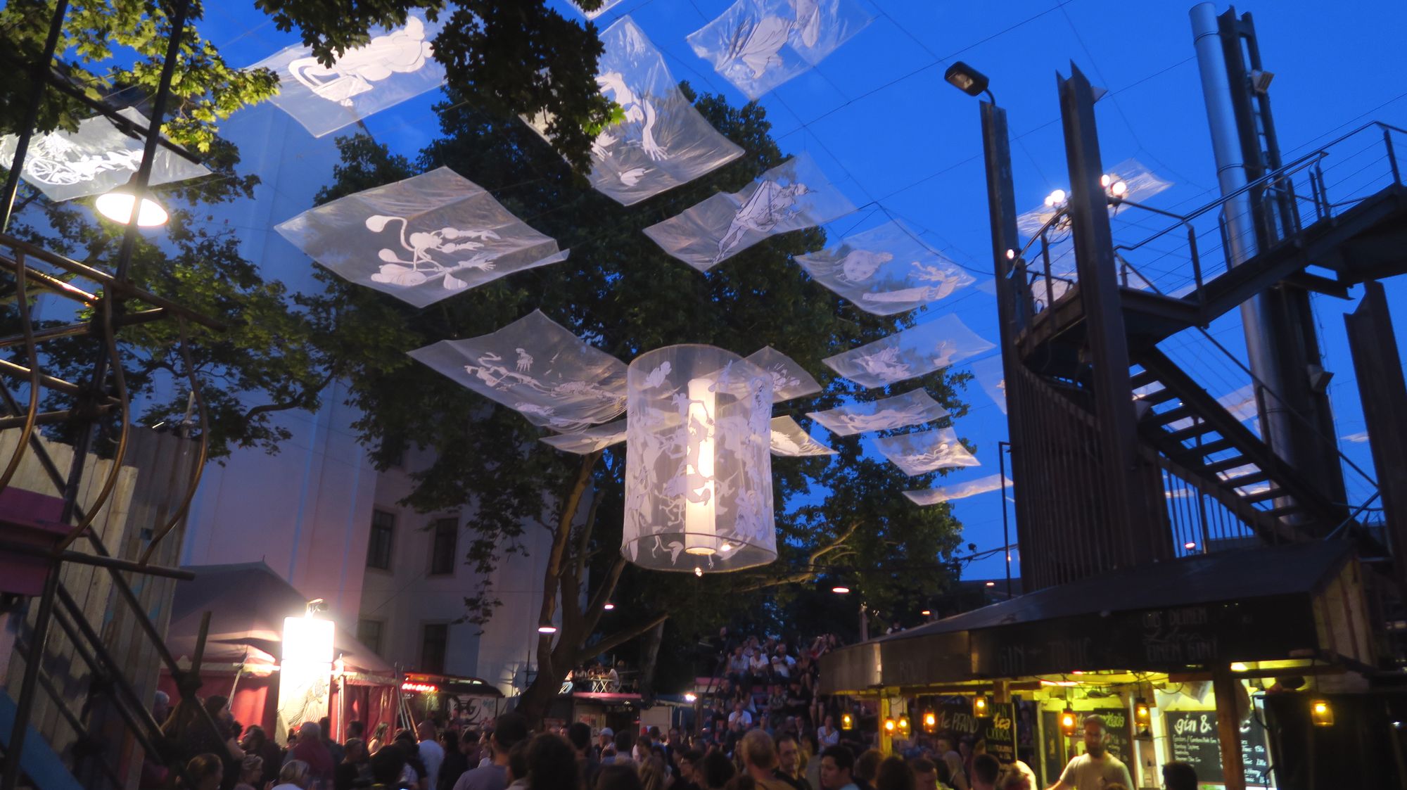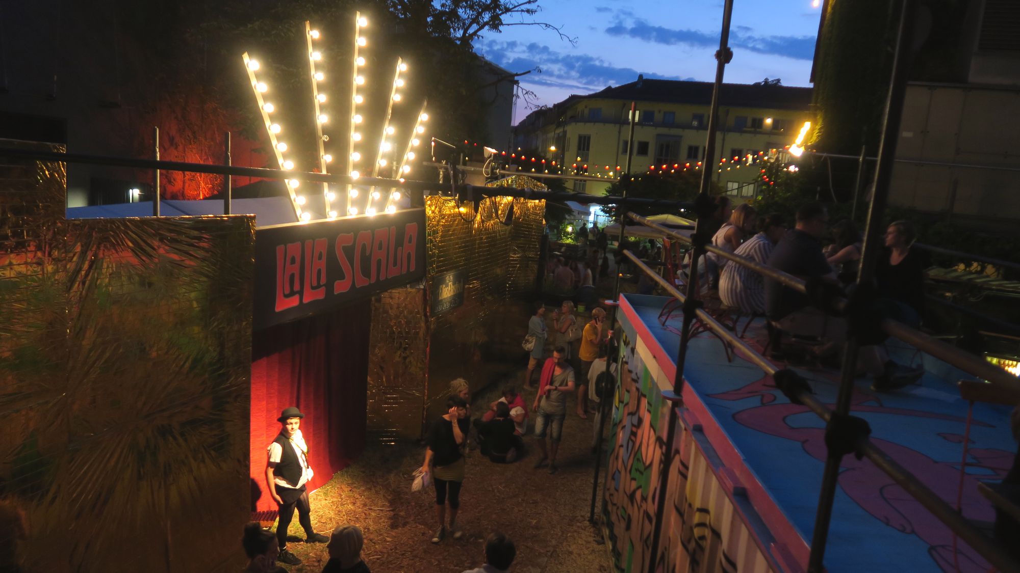 Inzwischen ist es zwischen den Zelten richtig voll geworden. Auf den vielen Hochsitzen ist es schwer ein Plätzchen zu bekommen. Die Budenkapelle intoniert, das Abendlicht taucht die herrliche Gestaltung von Muriel und César in ein tiefes Blau und mit einem gemütlichen Hellen lasse ich den Abend ausklingen.