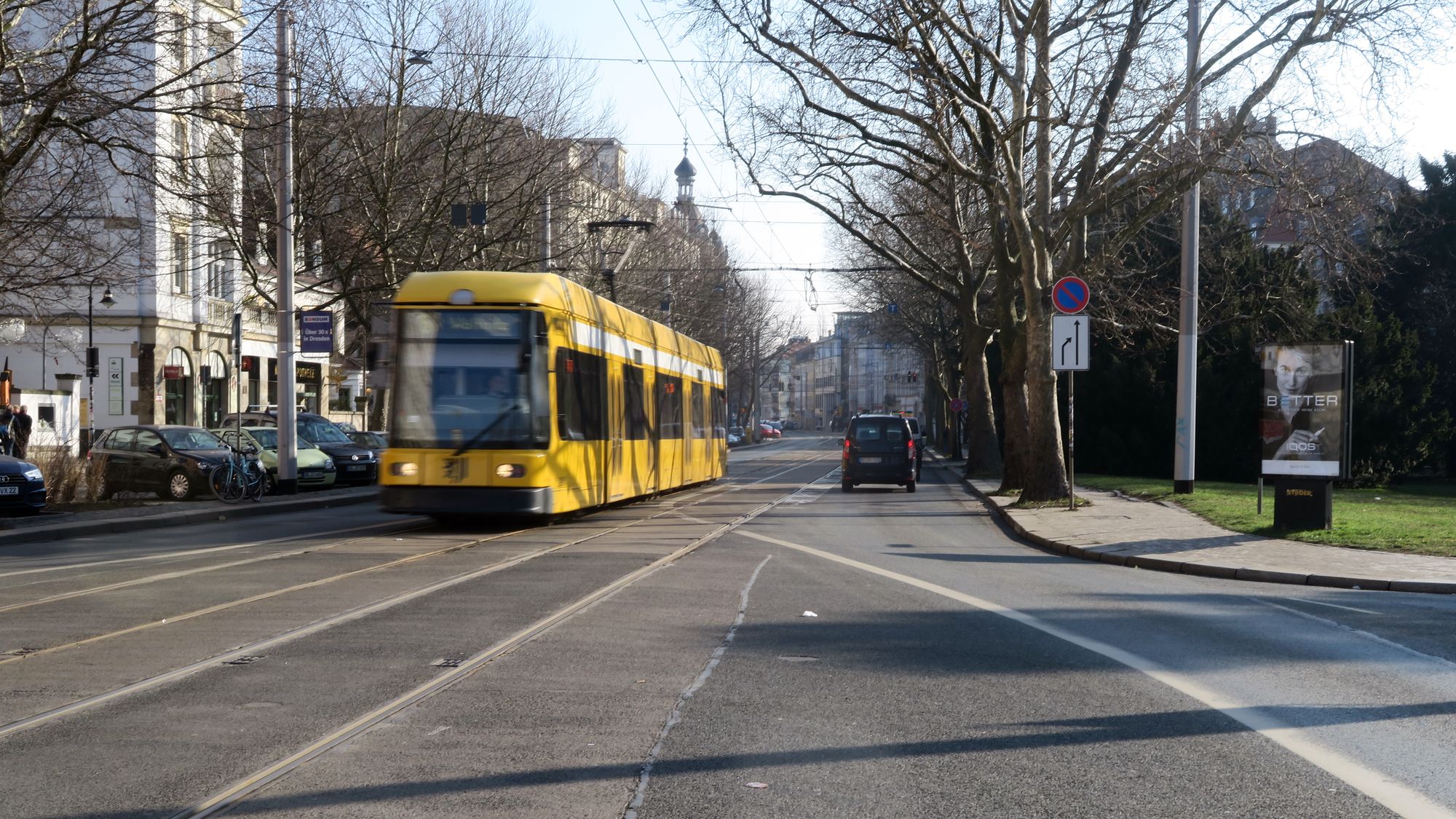Wenn ich mich recht erinnere, gab es eine Ausgangsplanung, die deutlich stärkere Eingriffe in die Grünfläche südlich der Bautzner vorsah. Die entsprechenden Normen geben ja Mindestbreiten für Fahrbahnen, Radwege und Gehwege vor, die im Falle eines so grundlegenden Umbaus einzuhalten gewesen wären. Dabei wären auch einige Bäume gefallen.