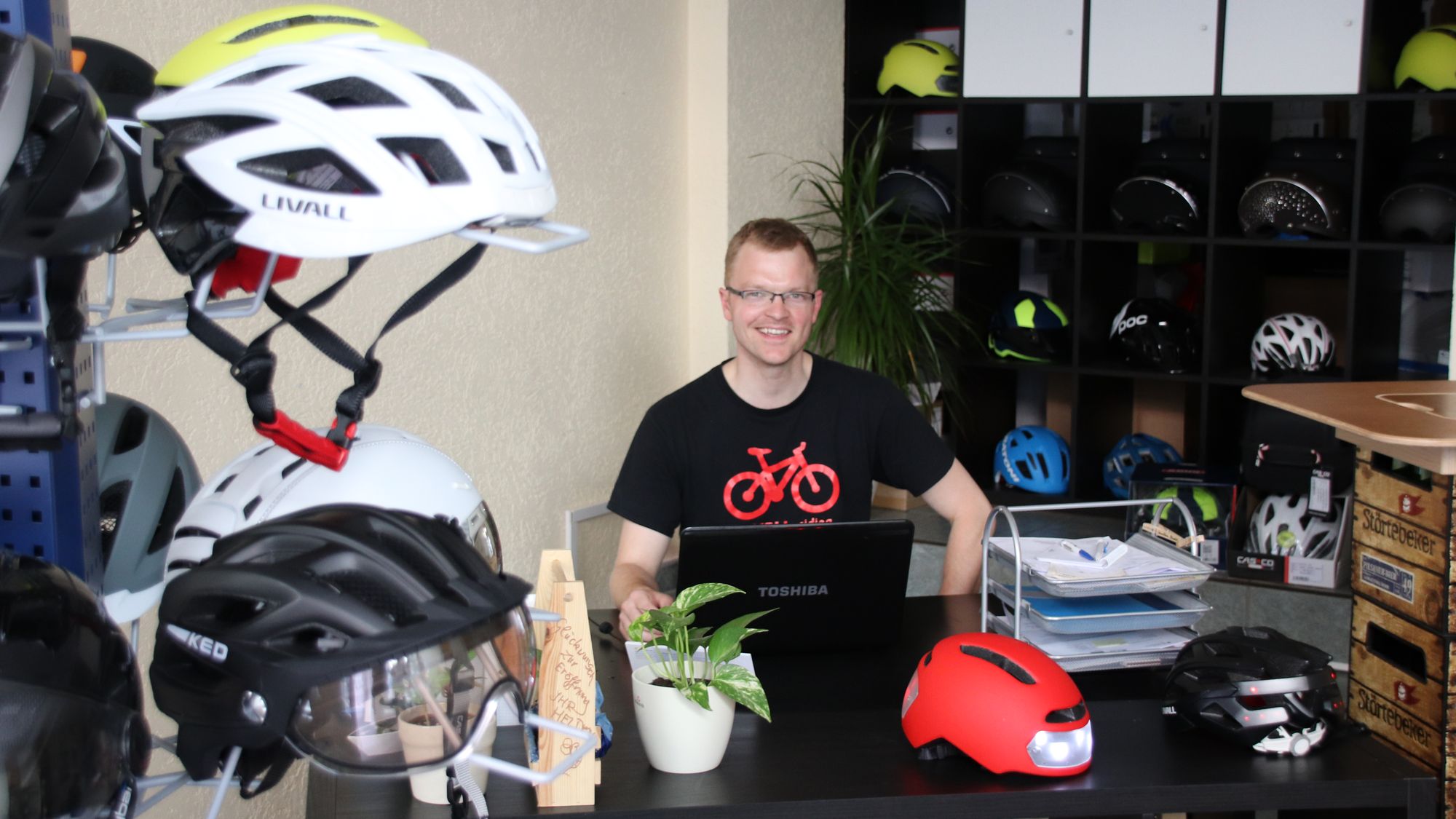 „Angefangen hat alles vor drei Jahren mit Bauhelmen“, erzählt Gordian. Damals war er noch Angestellter bei einer Bank und das Geschäft startete erstmal online. Doch mit Bauhelmen allein war kein großes Geschäft drin. Dann ergab es sich, dass sie bei einem Crowdfunding für einen Multimedia-Helm aus China mitmachten und das fertige Produkt in Deutschland verkauften.