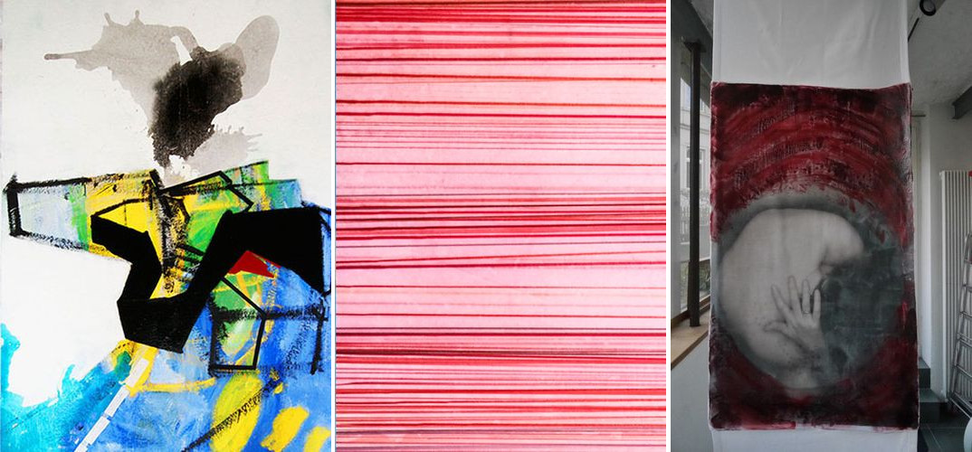 Susanne Hampe arbeitet mit zarten Linien und Figuren, erzeugt mit Papier, Wachs und Pigment eine Illusion von Raum in kleinster Dimension. Wachs ist auch das Material der Wahl von Karen Kling: Mit dicken Wachsschichten hebt sie Farben und Strukturen von Fotografien hervor und überführt sie in einmalige Bilder. Nicht zart, sondern kräftig und mit Verve malt Anke Ewers minimalistische Architekturen über expressive Farbflächen in Acryl.