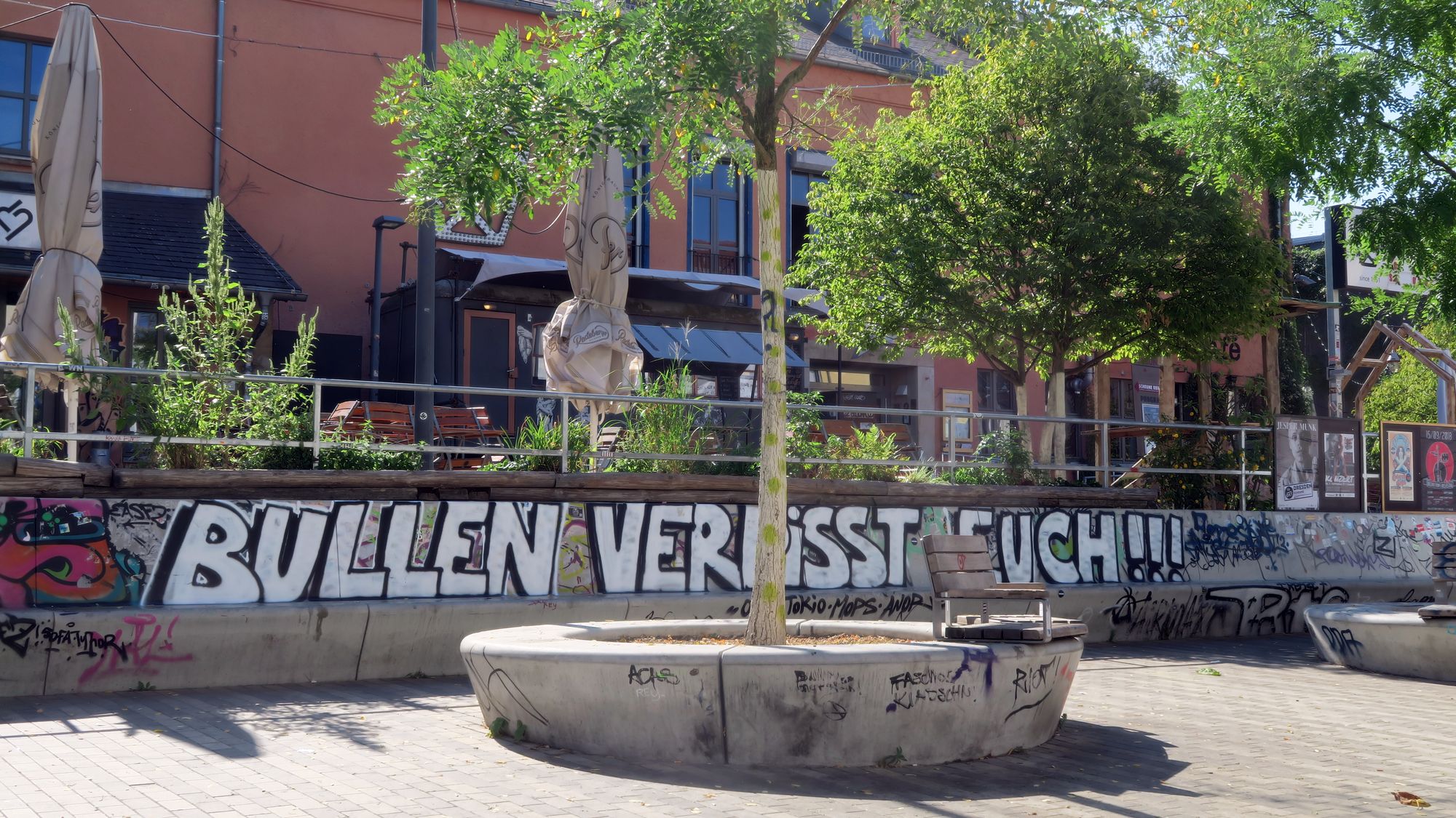 Absolut lächerlich und NICHT für die Neustadt sprechend ist dieses Graffiti. Wie kann sich jemand, der in der Neustadt wohnt, lebt und seine Kinder großzieht, dafür aussprechen, dass die Polizei sich „verpi**sen“ soll? Findet der Sprüher die Zustände vor der Scheune und dem Café Europa in Ordnung? Ist das seine Ansicht von Freiheit? Also manchmal verliere ich den Glauben an die Menschheit.