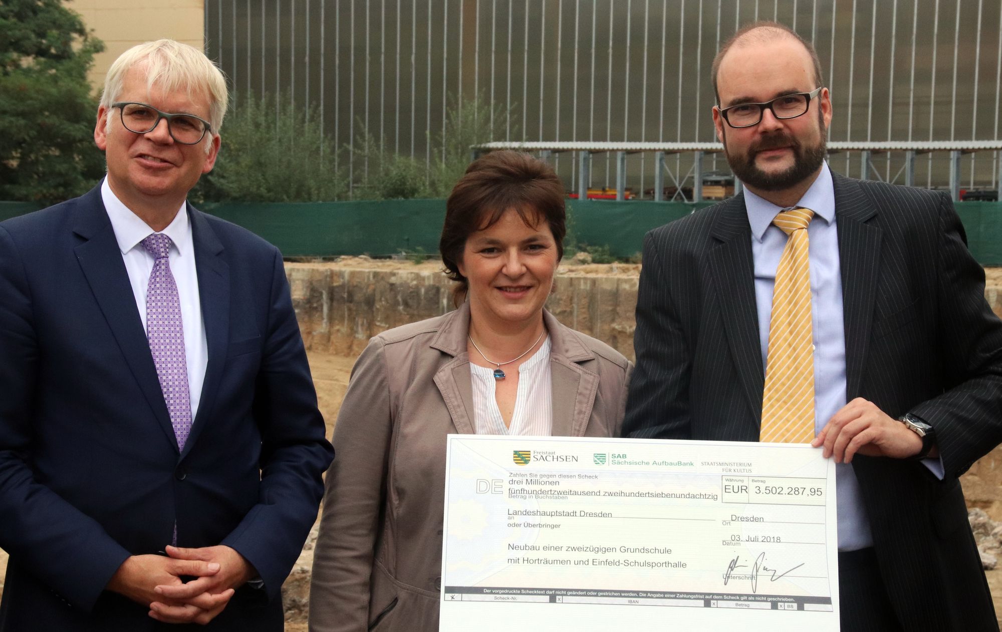Vor Ort bedankte sich der Bürgermeister, auch dafür, dass sich der Freistaat an den Kosten der Altlastensanierung auf dem Gelände zu 80 Prozent beteiligt. Diese Sanierung soll insgesamt rund 3,8 Millionen Euro kosten und ist fast abgeschlossen. In der übernächsten Woche soll mit der Verfüllung begonnen werden, so ein Vertreter der Bauüberwachung. Anschließend wird mit dem Bau der zweizügigen Grundschule mit Horträumen, einer Einfeldsporthalle und entsprechenden Außenanlagen begonnen.
