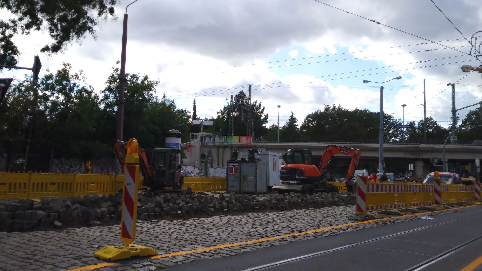 Schön auch, dass sogar durch die Baustellensituation die Sicherheit schon erhöht wird, weil man Richtung Neustadt jetzt ganz regulär auf dem Asphaltstreifen der Straßenbahn fahren muss. Früher musste man immer fürchten, rechts überholt, oder zumindest von hinten von Autofahrer gehasst und bedrängt zu werden, wenn man auf dem einzigen befahrbaren Stück der Straße fuhr. Gefällt mir deutlich besser jetzt.