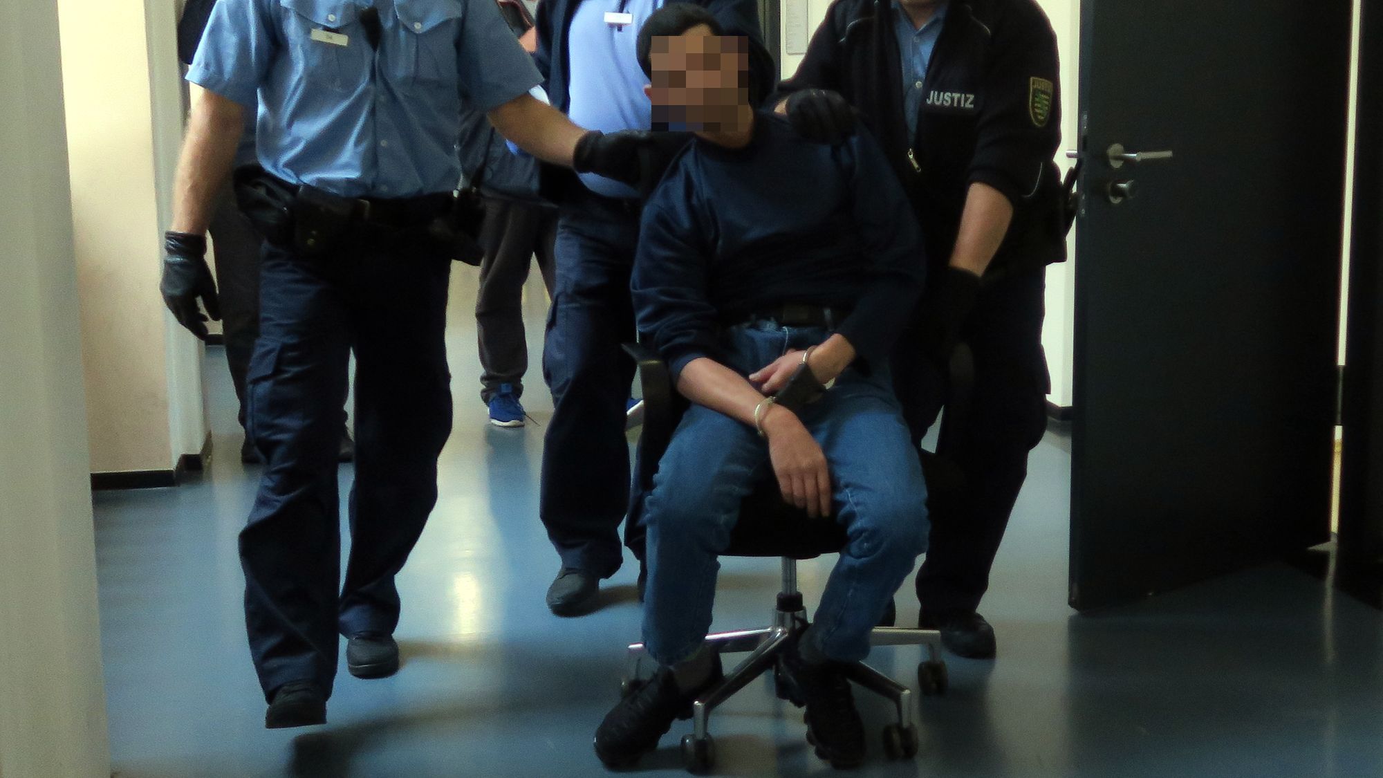 Beim Abtransport aus dem Verhandlungssaal machten es sich die Justiz-Beamten einfacher, sie schoben den Angeklagten auf einem Drehstuhl in den Haftkeller.