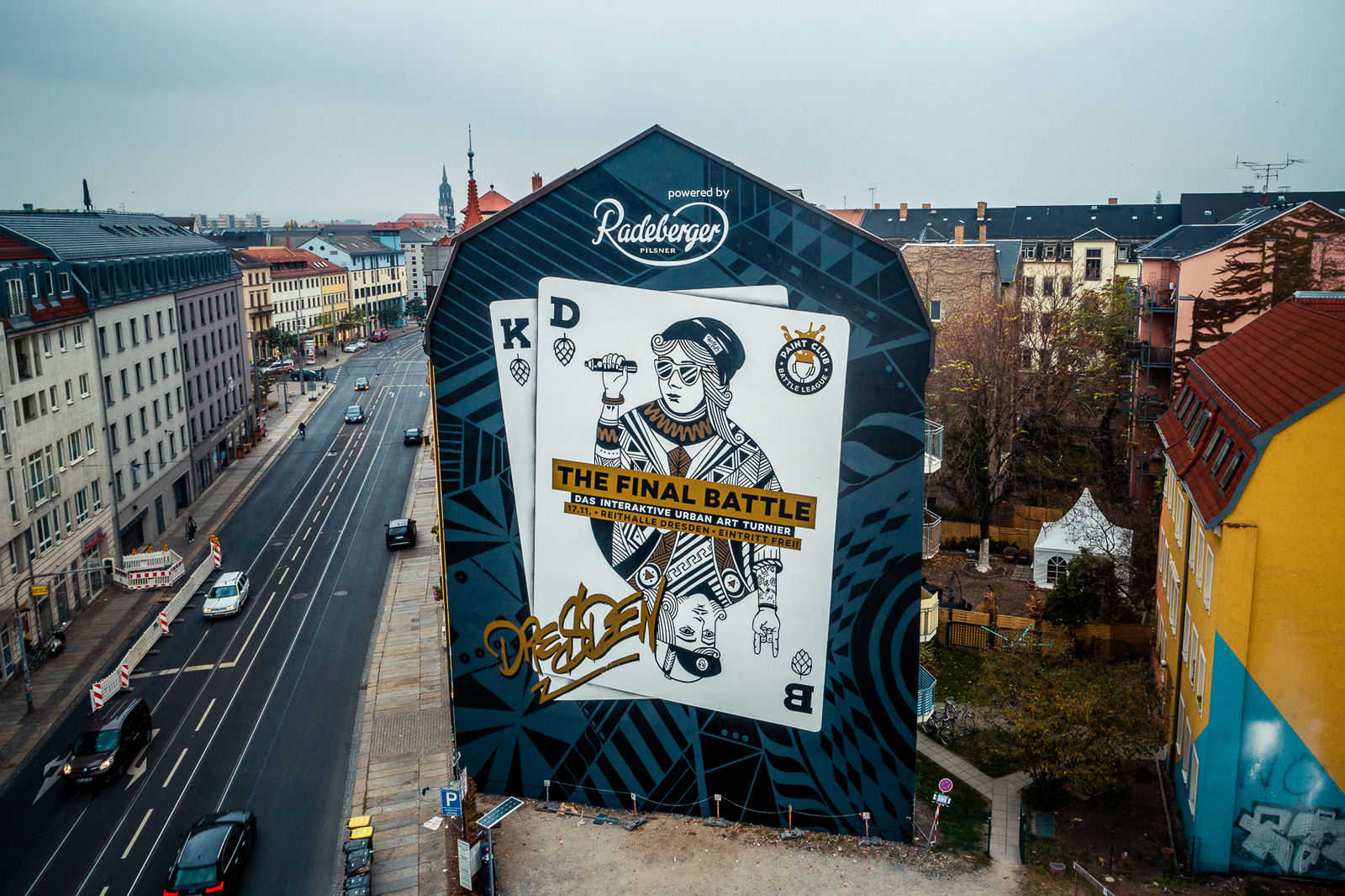 Ursprünglich gab es an der Hauswand mal eine Straßen-Café-Szene zu sehen, die dann von einem sogenannten Crosser zerstört wurde. Im September 2017 war dann ein riesiges rotes Wandbild entstanden. Den Entwurf hatte der Neustädter Siebdrucker und Künstler Lars P. Krause entwickelt, auch das Bild hatten die Bandits mit Unterstützung der Werbeagentur Cromatics realisiert. Geld für das Gerüst gab es von der Radeberger-Gruppe, auch das Motiv passte zur aktuellen Werbung des Bierbrauers. Die riesige Werbung war von Anfang an nur für einen begrenzten Zeitraum geplant. Dennoch ließen es sich ein paar nächtliche Farbbeutelbastler nicht nehmen, den riesigen Barmann zu bewerfen. Anschließend wurde die rote Wand getüncht und neu gestaltet.