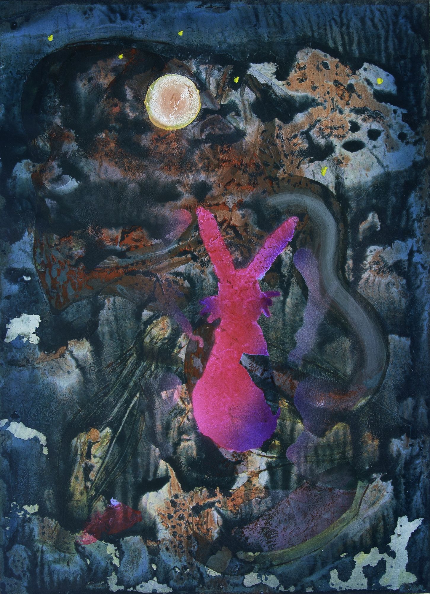 „Romance of a Rabbit Soul“, Öl und Acryl auf Papier, 53 x 41 cm, 2017