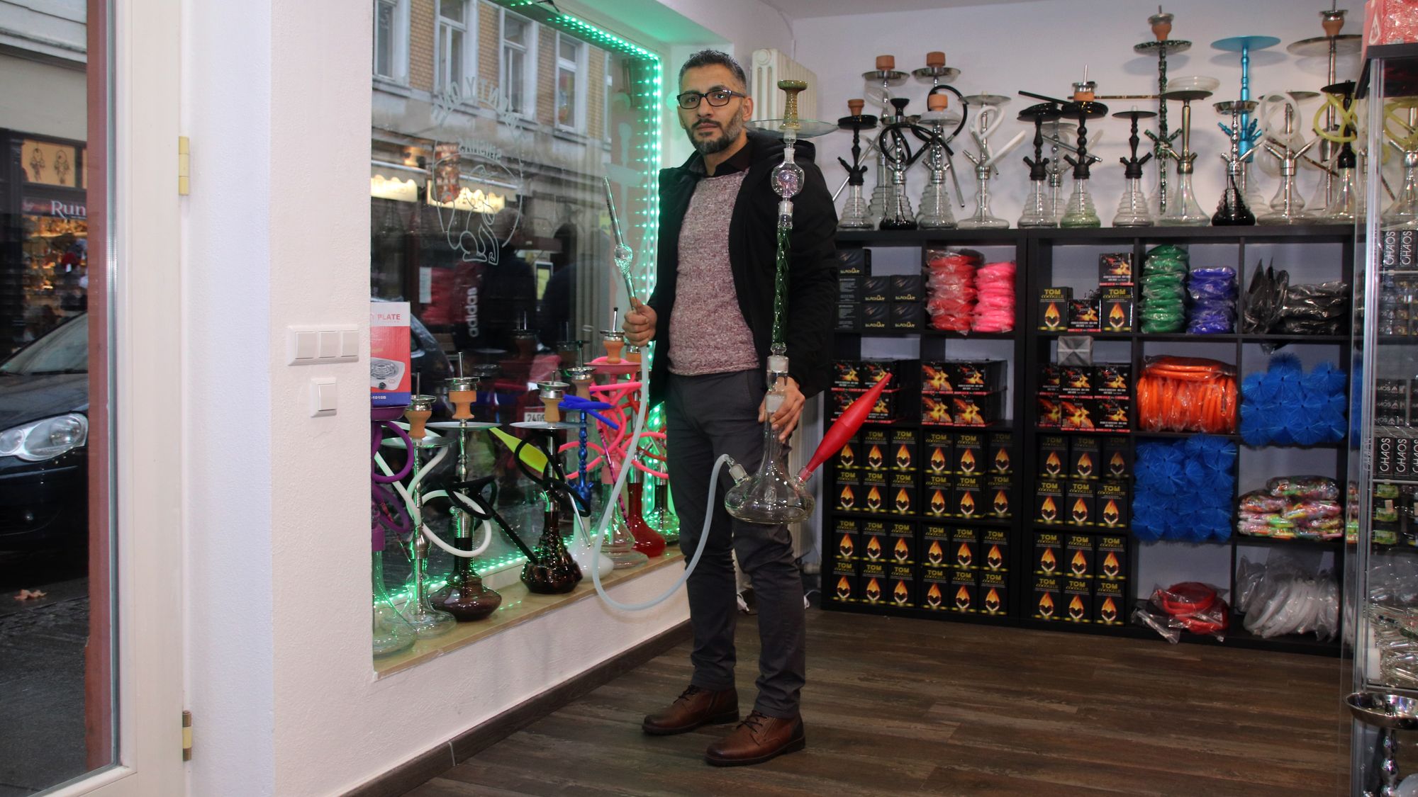 Das reicht von der Holzkohle über spezielle Kühlakkus, Mundstücke, Schläuche und ganz besondere Aufsätze. Einen führt Murat gleich vor. Der gläserne Totenkopf füllt sich mit Rauch und die Schwaden quellen ihm durch die leeren Augenhöhlen. Schön gruselig. Kann man nur hoffen, dass der Benutzer tatsächlich nur Tabak raucht und nicht im Angesicht des Glaskopfes auf einem Horrortrip abfährt. Gläserner Totenkopf für rauchige EffekteMurat kommt aus Syrien, dort hat der 33-Jährige bei einem Cousin im Shisha-Großhandel gearbeitet und so erste Erfahrungen in der Branche gesammelt. Das Grundprinzip ist bei jeder Shisha gleich. Der Rauch des glühenden Tabaks wird durch einen Schlauch und meist auch durch Wasser gezogen, damit er beim Raucher angenehm kühl und weich ankommt. Die Geräte kosten zwischen 15 und in der Luxusausführung 220 Euro. Dann zeigt er noch, was gerade besonders nachgefragt ist. Sogenannte Safari-Shishas – kleine, kompakte Geräte zum Mitnehmen.