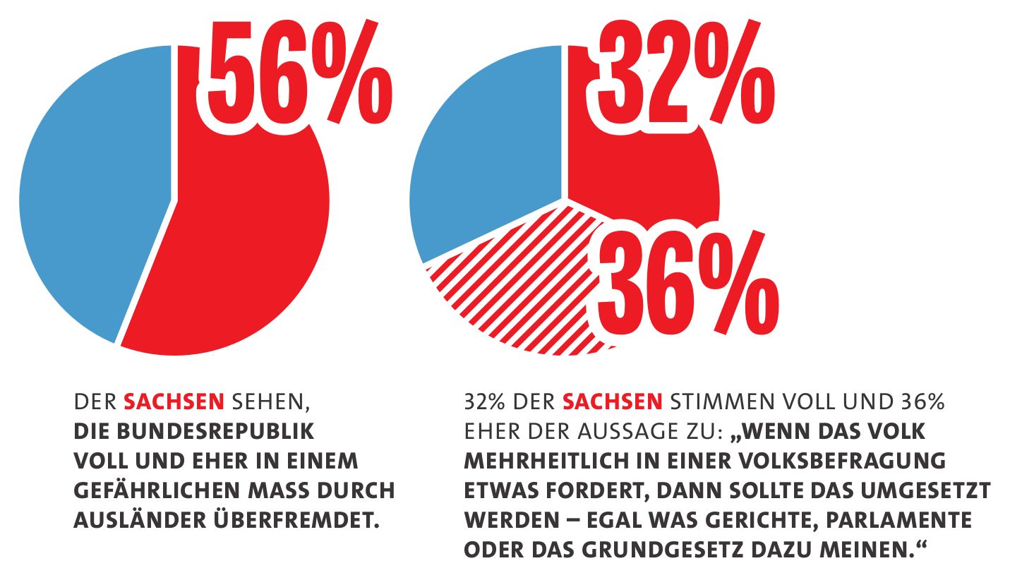 Allerdings tauchen in der Umfrage auch Ergebnisse auf, die hinterfragt werden müssen. So sagten immerhin 23 Prozent der 18 bis 29-Jährigen: „Wie in der Natur sollte sich in der Gesellschaft immer der Stärkere durchsetzen.“ 56 Prozent der Sachsen stimmen der Aussage zu: „Die Bundesrepublik ist durch die vielen Ausländer in einem gefährlichen Maß überfremdet.“ Diese Aussage zieht sich durch alle Schichten und Altersklassen, bei den jungen Leute unter 30 und den Großstädter findet sie jedoch keine Mehrheit.