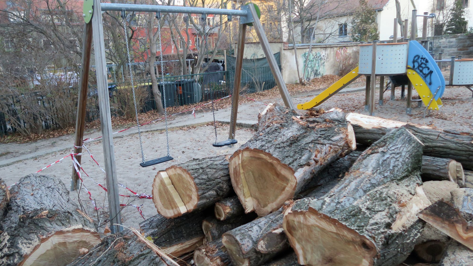 Die Hauptausrede am Spielplatz war laut auskunftgebender Person oben das Vorhandensein von Totholz, was ja nun überall gang&gebe ist. Selbst viel Totholz kann besser entfernt werden, die Bäume in Gänze waren mopsfidel und kernholz-gesund. Die Morschungen sind eher in manch Amts-Oberstübchen zu finden – und das reichlich. Warum solche Angst vor einer Fälllllliste Spielplätze? Dann sinds höchstens zwei Mistgabeln im 5.Stock – also keene Sorge. Alles nur Belustigung, volles Rohr in die Klimakatastrophe. Merkt ja nichtmal jemand.