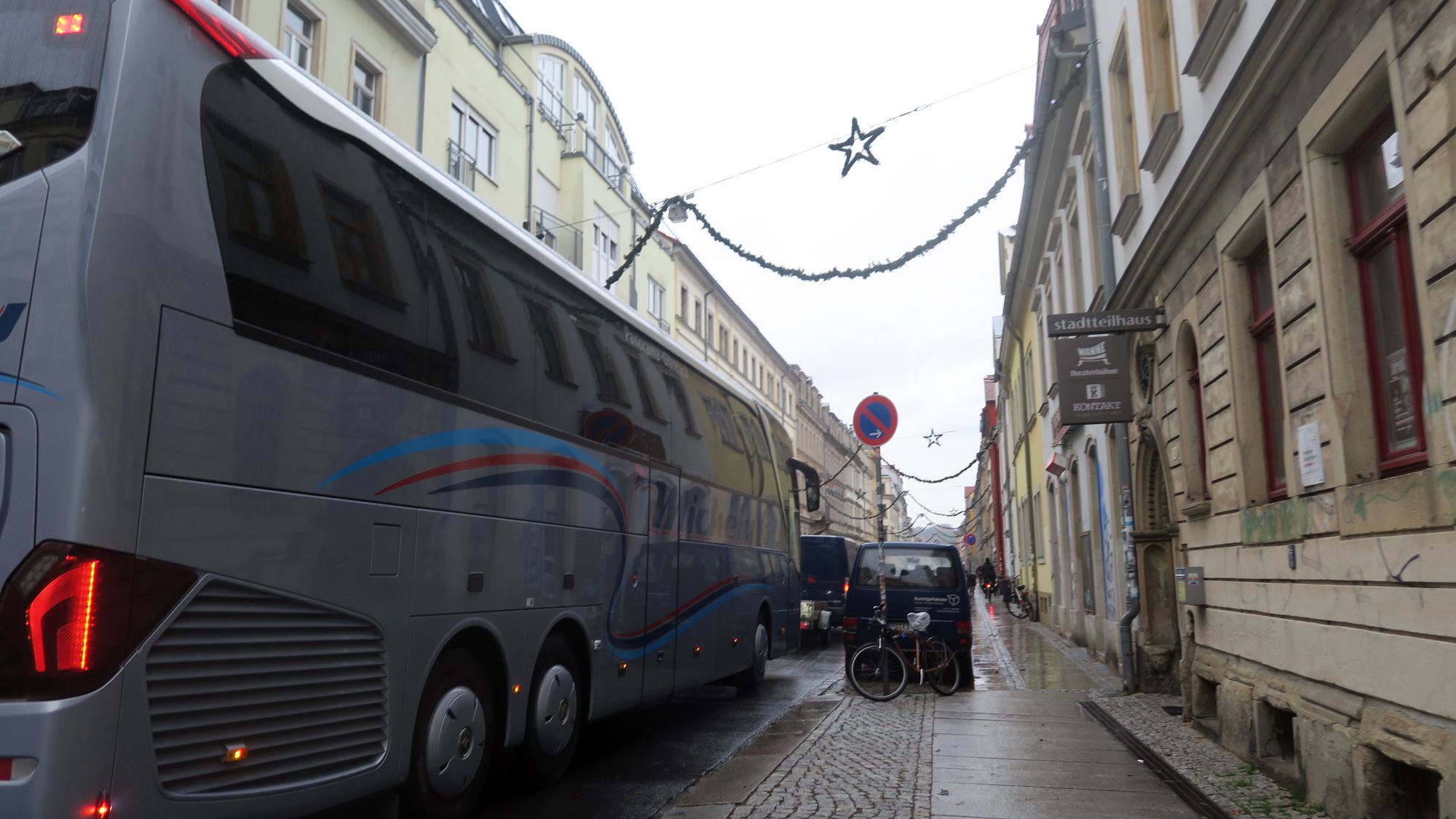 Nach meiner Beobachtung entsteigen solchen Bussen meistens Schulklassen mit Rollkoffern, die in einer der umliegenden „Herbergen“ nächtigen. Solche Busse hingen, ebenso wie manch andere Sattelschlepper, auch schon öfter auf dem Martin-Luther-Platz fest, wenn vorm Friseur ein Richtig-Parker steht. Wahrscheinlich aber sind Navis lernfähig: das ist nämlich schon eine ganze Weile nicht mehr passiert.