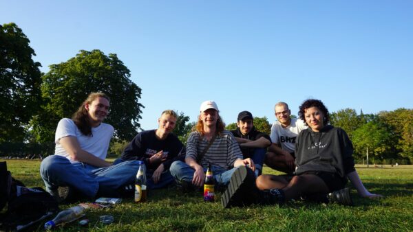 Ein Frühlingsmittag im Park, Kinder auf Fahrrädern, junge Leute, die Pizza aus Kartons essen. Ich sitze hier mit Jule und