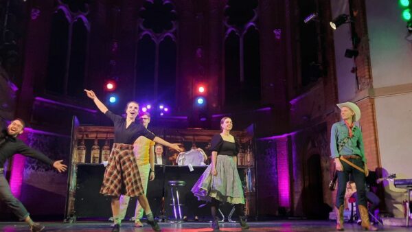 Unter mit schwarzem Stoff abgedunkelten Kirchenfenstern, in verlebtenBacksteinen eingefasst, ein schlichter Tresen mit Schnapsflaschen und ein paar in Gespräch und